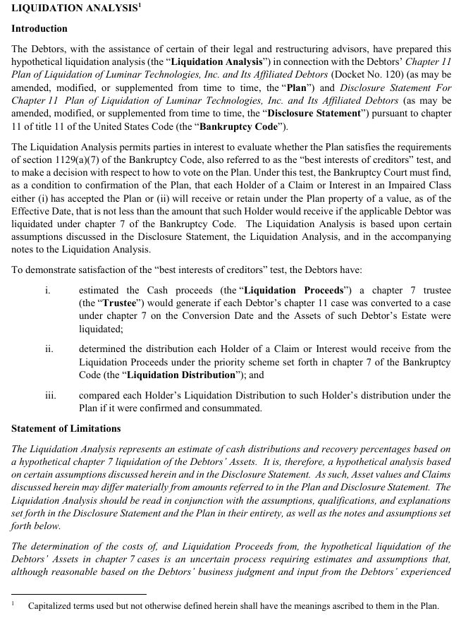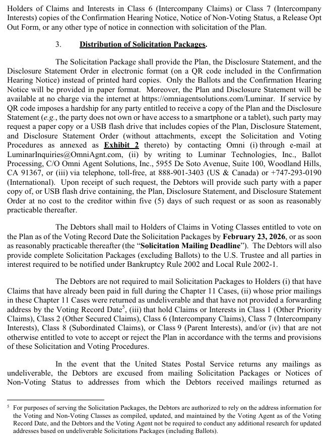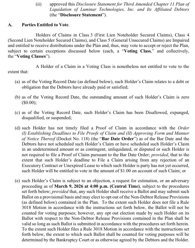 SOLICITING VOTES ON THE THIRD AMENDED CHAPTER 11 PLAN OF LIQUIDATION OF LUMINAR TECHNOLOGIES, INC. AND ITS AFFILIATED DEBTORS, DATED FEBRUARY 18, 2026 (THE “PLAN”),2 AND MAY NOT BE RELIED UPON FOR ANY PURPOSE OTHER THAN TO DETERMINE HOW TO VOTE ON THE PLAN. A COPY OF THE PLAN IS ANNEXED HERETO AS EXHIBIT A. NO SOLICITATION OF VOTES TO ACCEPT OR REJECT THE