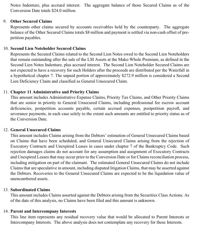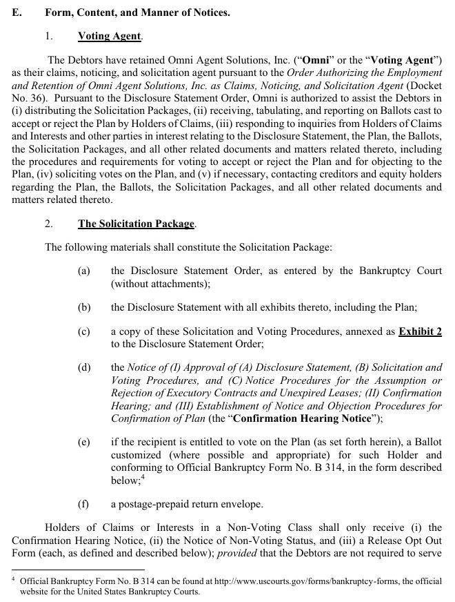 and Disclosure Statement, (iii) notice of the Holders’ non-voting status, and (iv) information about how to obtain copies of the Disclosure Statement and Plan. In addition, the Notice of Non-Voting Status contains the full text of the