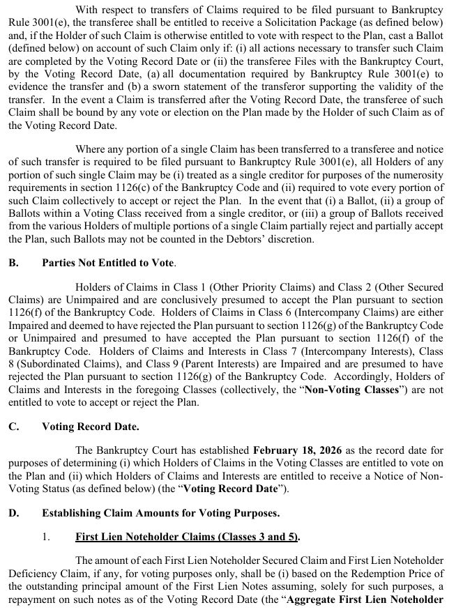 THE RECORD DATE FOR DETERMINING WHICH HOLDERS OF CLAIMS MAY VOTE ON THE PLAN IS FEBRUARY 18, 2026 (THE “RECORD DATE”).