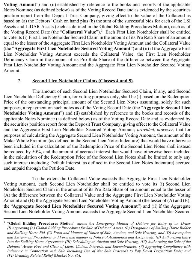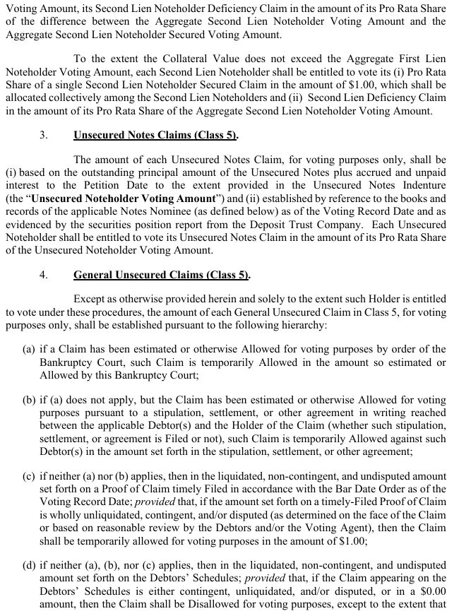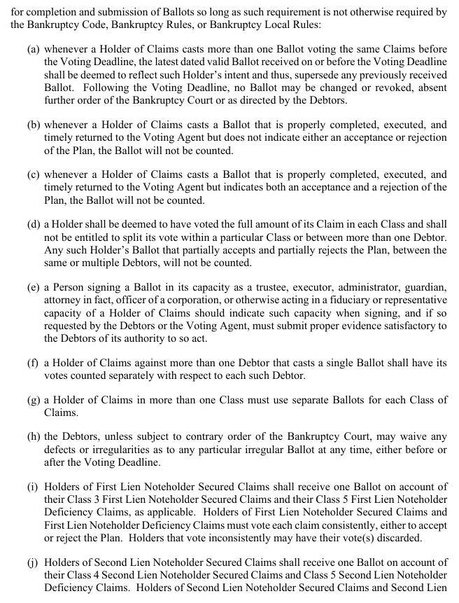 Secured Claims shall receive one Ballot on account of their Class 3 First Lien Noteholder Secured Claims and their Class 5 First Lien Noteholder Deficiency Claims, as applicable. Holders of First Lien Noteholder Secured Claims and First Lien