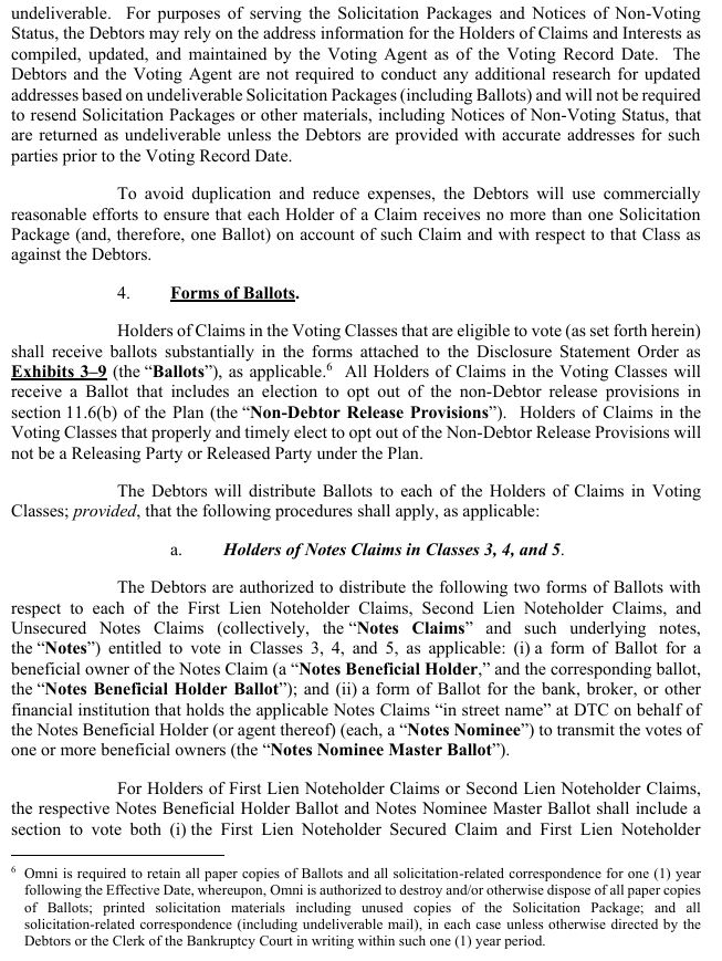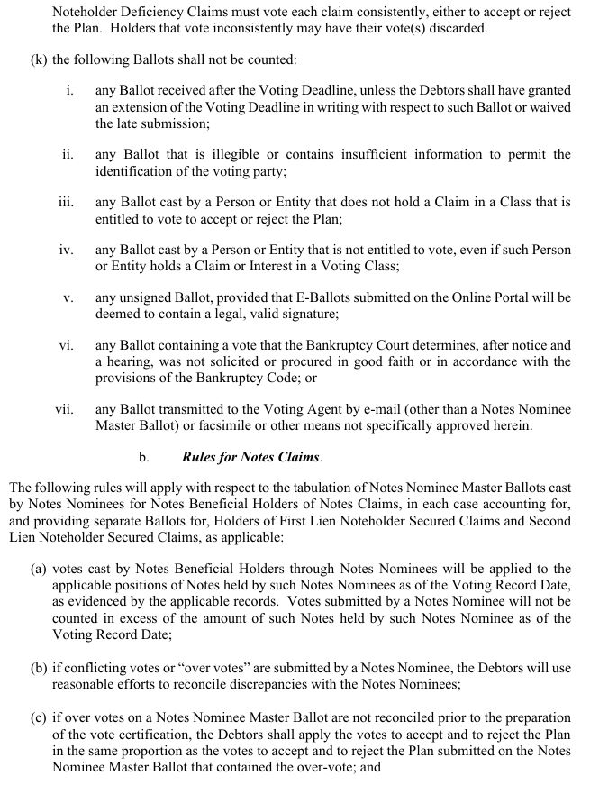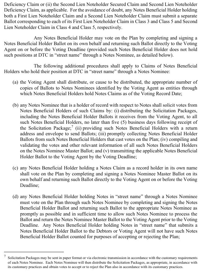 Ballot counted for purposes of accepting or rejecting the Plan; 7 Solicitation Packages may be sent in paper format or via electronic transmission in accordance with the customary requirements of each Notes Nominee. Each Notes Nominee will