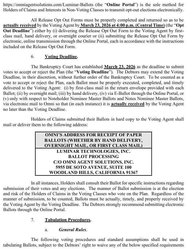 electronic, online transmission through the Online Portal, each in accordance with the instructions included on the Release Opt Out Form. 6. Voting Deadline. The Bankruptcy Court has established March 23, 2026 as the deadline to submit