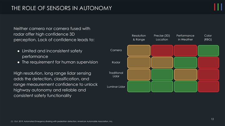 THE ROLE OF SENSORS IN AUTONOMY Neither camera nor camera fused with radar offer high confidence 3D Resolution Precise (3D) Performance Color & Range Location in Weather (RBG) perception. Lack of confidence leads to: Camera ● Limited and inconsistent safety performance ● The requirement for human supervision Radar Traditional High resolution, long range lidar sensing Lidar adds the detection, classification, and range measurement confidence to unlock Luminar Lidar highway autonomy and reliable and consistent safety functionality 12 (1) Oct. 2019, Automated Emergency Braking with pedestrian detection, American Automobile Association, Inc.THE ROLE OF SENSORS IN AUTONOMY Neither camera nor camera fused with radar offer high confidence 3D Resolution Precise (3D) Performance Color & Range Location in Weather (RBG) perception. Lack of confidence leads to: Camera ● Limited and inconsistent safety performance ● The requirement for human supervision Radar Traditional High resolution, long range lidar sensing Lidar adds the detection, classification, and range measurement confidence to unlock Luminar Lidar highway autonomy and reliable and consistent safety functionality 12 (1) Oct. 2019, Automated Emergency Braking with pedestrian detection, American Automobile Association, Inc.