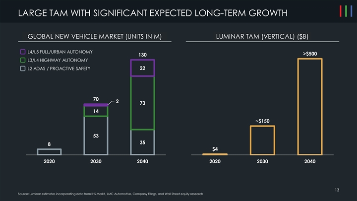 LARGE TAM WITH SIGNIFICANT EXPECTED LONG-TERM GROWTH GLOBAL NEW VEHICLE MARKET (UNITS IN M) LUMINAR TAM (VERTICAL) ($B) L4/L5 FULL/URBAN AUTONOMY >$500 130 L3/L4 HIGHWAY AUTONOMY L2 ADAS / PROACTIVE SAFETY 22 70 2 73 14 ~$150 53 35 8 $4 2020 2030 2040 2020 2030 2040 13 Source: Luminar estimates incorporating data from IHS Markit, LMC Automotive, Company Filings, and Wall Street equity researchLARGE TAM WITH SIGNIFICANT EXPECTED LONG-TERM GROWTH GLOBAL NEW VEHICLE MARKET (UNITS IN M) LUMINAR TAM (VERTICAL) ($B) L4/L5 FULL/URBAN AUTONOMY >$500 130 L3/L4 HIGHWAY AUTONOMY L2 ADAS / PROACTIVE SAFETY 22 70 2 73 14 ~$150 53 35 8 $4 2020 2030 2040 2020 2030 2040 13 Source: Luminar estimates incorporating data from IHS Markit, LMC Automotive, Company Filings, and Wall Street equity research