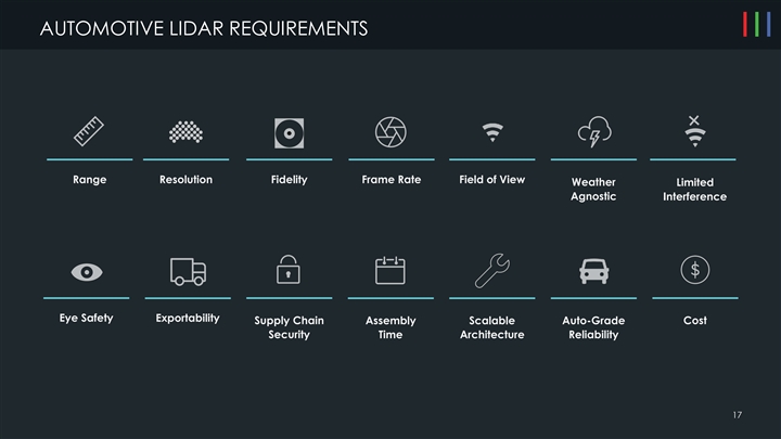 AUTOMOTIVE LIDAR REQUIREMENTS Range Resolution Fidelity Frame Rate Field of View Weather Limited Agnostic Interference Eye Safety Exportability Supply Chain Assembly Scalable Auto-Grade Cost Security Time Architecture Reliability 17AUTOMOTIVE LIDAR REQUIREMENTS Range Resolution Fidelity Frame Rate Field of View Weather Limited Agnostic Interference Eye Safety Exportability Supply Chain Assembly Scalable Auto-Grade Cost Security Time Architecture Reliability 17