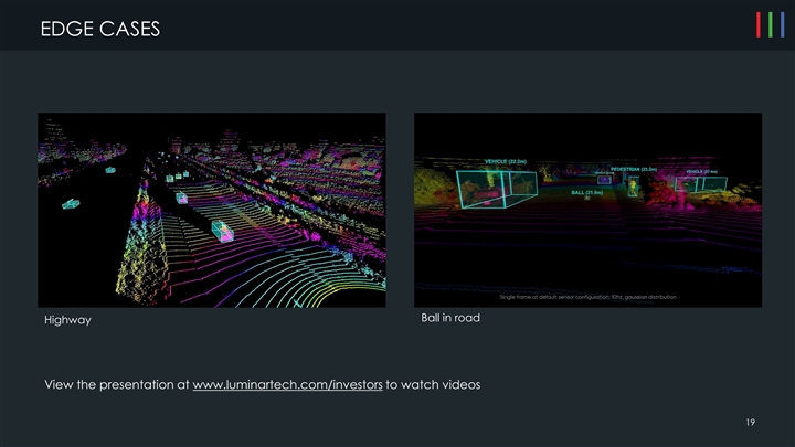 EDGE CASES Ball in road Highway View the presentation at www.luminartech.com/investors to watch videos 19EDGE CASES Ball in road Highway View the presentation at www.luminartech.com/investors to watch videos 19