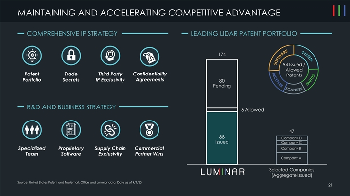 MAINTAINING AND ACCELERATING COMPETITIVE ADVANTAGE COMPREHENSIVE IP STRATEGY LEADING LIDAR PATENT PORTFOLIO 174 94 Issued / Allowed Patent Trade Third Party Confidentiality Patents Portfolio Secrets IP Exclusivity Agreements 80 Pending R&D AND BUSINESS STRATEGY 6 Allowed 47 88 Company D Issued Company C Company B Specialized Proprietary Supply Chain Commercial Team Software Exclusivity Partner Wins Company A Luminar Selected Companies (Aggregate Issued) Source: United States Patent and Trademark Office and Luminar data. Data as of 9/1/20. 21 MAINTAINING AND ACCELERATING COMPETITIVE ADVANTAGE COMPREHENSIVE IP STRATEGY LEADING LIDAR PATENT PORTFOLIO 174 94 Issued / Allowed Patent Trade Third Party Confidentiality Patents Portfolio Secrets IP Exclusivity Agreements 80 Pending R&D AND BUSINESS STRATEGY 6 Allowed 47 88 Company D Issued Company C Company B Specialized Proprietary Supply Chain Commercial Team Software Exclusivity Partner Wins Company A Luminar Selected Companies (Aggregate Issued) Source: United States Patent and Trademark Office and Luminar data. Data as of 9/1/20. 21
