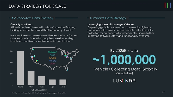 AUTONOMOUS VEHICLE LANDSCAPE Luminar is the only company capable of powering passenger vehicle highway autonomy $30,000 $30,000 (Mar-20) $19,000 $15,000 (May-19) $7,250 (Jul-19) $7,250 $5,000 (April-19) $4,000 (Sep-19) NA $2,900 $3,020 $3,000+ NA (Aug-20) (Feb-19) (Feb-20) $2,500 $1,500 (Jun-20) $593 (Jul-20) PASSENGER VEHICLES ROBOTAXI (Consumer application, highway focus) (Ridesharing application, urban focus) 22 Source: Company filings, press releases, Pitchbook, Financial Times (Waymo) VALUATION ($M)AUTONOMOUS VEHICLE LANDSCAPE Luminar is the only company capable of powering passenger vehicle highway autonomy $30,000 $30,000 (Mar-20) $19,000 $15,000 (May-19) $7,250 (Jul-19) $7,250 $5,000 (April-19) $4,000 (Sep-19) NA $2,900 $3,020 $3,000+ NA (Aug-20) (Feb-19) (Feb-20) $2,500 $1,500 (Jun-20) $593 (Jul-20) PASSENGER VEHICLES ROBOTAXI (Consumer application, highway focus) (Ridesharing application, urban focus) 22 Source: Company filings, press releases, Pitchbook, Financial Times (Waymo) VALUATION ($M)