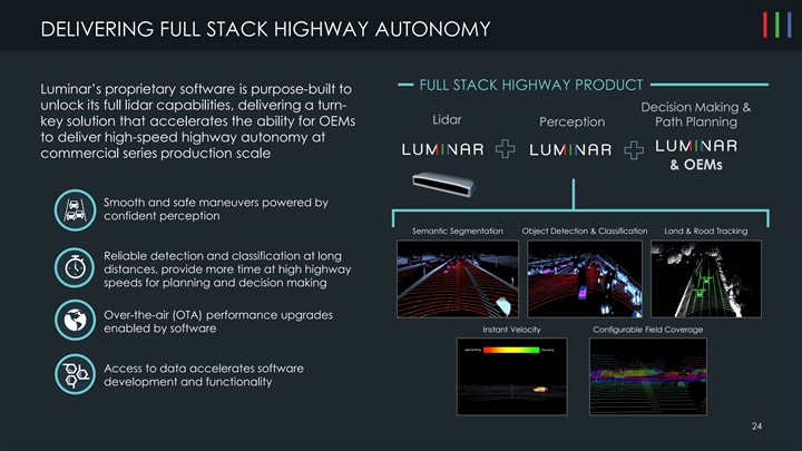 DELIVERING FULL STACK HIGHWAY AUTONOMY FULL STACK HIGHWAY PRODUCT Luminar’s proprietary software is purpose-built to unlock its full lidar capabilities, delivering a turn- Decision Making & Lidar key solution that accelerates the ability for OEMs Perception Path Planning to deliver high-speed highway autonomy at commercial series production scale & OEMs Smooth and safe maneuvers powered by confident perception Semantic Segmentation Object Detection & Classification Land & Road Tracking Reliable detection and classification at long distances, provide more time at high highway speeds for planning and decision making Over-the-air (OTA) performance upgrades enabled by software Instant Velocity Configurable Field Coverage Access to data accelerates software development and functionality 24DELIVERING FULL STACK HIGHWAY AUTONOMY FULL STACK HIGHWAY PRODUCT Luminar’s proprietary software is purpose-built to unlock its full lidar capabilities, delivering a turn- Decision Making & Lidar key solution that accelerates the ability for OEMs Perception Path Planning to deliver high-speed highway autonomy at commercial series production scale & OEMs Smooth and safe maneuvers powered by confident perception Semantic Segmentation Object Detection & Classification Land & Road Tracking Reliable detection and classification at long distances, provide more time at high highway speeds for planning and decision making Over-the-air (OTA) performance upgrades enabled by software Instant Velocity Configurable Field Coverage Access to data accelerates software development and functionality 24