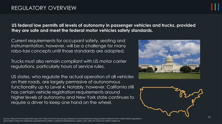 REGULATORY OVERVIEW US federal law permits all levels of autonomy in passenger vehicles and trucks, provided they are safe and meet the federal motor vehicles safety standards. Current requirements for occupant safety, seating and instrumentation, however, will be a challenge for many robo-taxi concepts until those standards are adapted. Trucks must also remain compliant with US motor carrier regulations, particularly hours of service rules. US states, who regulate the actual operation of all vehicles on their roads, are largely permissive of autonomous functionality up to Level 4. Notably, however, California still has certain vehicle registration requirements around higher levels of autonomy and New York state continues to require a driver to keep one hand on the wheel. 31 Source: https://www.transportation.gov/AV; https://www.fmcsa.dot.gov/research-and-analysis/technology/review-federal-motor-carrier-safety-regulations- automated; https://en.wikipedia.org/wiki/United_States_Capitol#/media/File:US_Capitol_west_side.JPG photo by Martin FalbisonerREGULATORY OVERVIEW US federal law permits all levels of autonomy in passenger vehicles and trucks, provided they are safe and meet the federal motor vehicles safety standards. Current requirements for occupant safety, seating and instrumentation, however, will be a challenge for many robo-taxi concepts until those standards are adapted. Trucks must also remain compliant with US motor carrier regulations, particularly hours of service rules. US states, who regulate the actual operation of all vehicles on their roads, are largely permissive of autonomous functionality up to Level 4. Notably, however, California still has certain vehicle registration requirements around higher levels of autonomy and New York state continues to require a driver to keep one hand on the wheel. 31 Source: https://www.transportation.gov/AV; https://www.fmcsa.dot.gov/research-and-analysis/technology/review-federal-motor-carrier-safety-regulations- automated; https://en.wikipedia.org/wiki/United_States_Capitol#/media/File:US_Capitol_west_side.JPG photo by Martin Falbisoner
