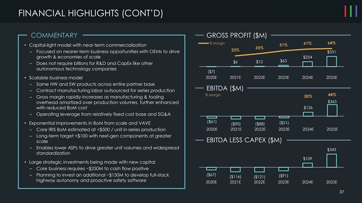 FINANCIAL HIGHLIGHTS (CONT’D) COMMENTARY GROSS PROFIT ($M) 64% % Margin 61% • Capital-light model with near-term commercialization 51% 35% 22% – Focused on nearer-term business opportunities with OEMs to drive $531 growth & economies of scale $254 $63 $6 $12 – Does not require billions for R&D and CapEx like other autonomous technology companies ($7) 2020E 2021E 2022E 2023E 2024E 2025E • Scalable business model – Same HW and SW products across entire partner base EBITDA ($M) – Contract manufacturing labor outsourced for series production % Margin 44% 30% – Gross margin rapidly increases as manufacturing & tooling 0.4 $365 overhead amortized over production volumes, further enhanced 0.2 with reduced BoM cost $126 0 -0.2 – Operating leverage from relatively fixed cost base and SG&A -0.4 ($61) ($250) ($51) -0.6 • Exponential improvements in BoM from scale and VAVE ($90) ($88) 2020E 2021E 2022E 2023E 2024E 2025E – Core IRIS BoM estimated at <$500 / unit in series production – Long-term target <$100 with next-gen components at greater EBITDA LESS CAPEX ($M) scale – Enables lower ASPs to drive greater unit volumes and widespread $343 standardization $109 • Large strategic investments being made with new capital – Core business requires ~$250M to cash flow positive – Planning to invest an additional ~$150M to develop full-stack ($67) ($91) ($116) ($121) highway autonomy and proactive safety software 2020E 2021E 2022E 2023E 2024E 2025E 37 37FINANCIAL HIGHLIGHTS (CONT’D) COMMENTARY GROSS PROFIT ($M) 64% % Margin 61% • Capital-light model with near-term commercialization 51% 35% 22% – Focused on nearer-term business opportunities with OEMs to drive $531 growth & economies of scale $254 $63 $6 $12 – Does not require billions for R&D and CapEx like other autonomous technology companies ($7) 2020E 2021E 2022E 2023E 2024E 2025E • Scalable business model – Same HW and SW products across entire partner base EBITDA ($M) – Contract manufacturing labor outsourced for series production % Margin 44% 30% – Gross margin rapidly increases as manufacturing & tooling 0.4 $365 overhead amortized over production volumes, further enhanced 0.2 with reduced BoM cost $126 0 -0.2 – Operating leverage from relatively fixed cost base and SG&A -0.4 ($61) ($250) ($51) -0.6 • Exponential improvements in BoM from scale and VAVE ($90) ($88) 2020E 2021E 2022E 2023E 2024E 2025E – Core IRIS BoM estimated at <$500 / unit in series production – Long-term target <$100 with next-gen components at greater EBITDA LESS CAPEX ($M) scale – Enables lower ASPs to drive greater unit volumes and widespread $343 standardization $109 • Large strategic investments being made with new capital – Core business requires ~$250M to cash flow positive – Planning to invest an additional ~$150M to develop full-stack ($67) ($91) ($116) ($121) highway autonomy and proactive safety software 2020E 2021E 2022E 2023E 2024E 2025E 37 37
