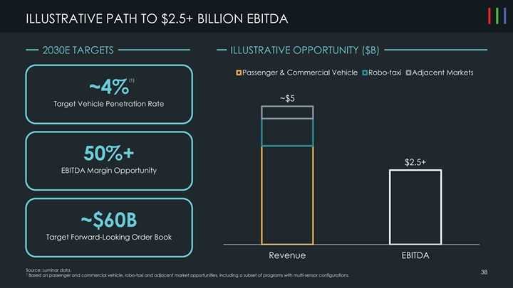 ILLUSTRATIVE PATH TO $2.5+ BILLION EBITDA 2030E TARGETS ILLUSTRATIVE OPPORTUNITY ($B) Passenger & Commercial Vehicle Robo-taxi Adjacent Markets (1) ~4% ~$5 Target Vehicle Penetration Rate 50%+ $2.5+ EBITDA Margin Opportunity ~$60B Target Forward-Looking Order Book Revenue EBITDA Source: Luminar data. 38 1 Based on passenger and commercial vehicle, robo-taxi and adjacent market opportunities, including a subset of programs with multi-sensor configurations.ILLUSTRATIVE PATH TO $2.5+ BILLION EBITDA 2030E TARGETS ILLUSTRATIVE OPPORTUNITY ($B) Passenger & Commercial Vehicle Robo-taxi Adjacent Markets (1) ~4% ~$5 Target Vehicle Penetration Rate 50%+ $2.5+ EBITDA Margin Opportunity ~$60B Target Forward-Looking Order Book Revenue EBITDA Source: Luminar data. 38 1 Based on passenger and commercial vehicle, robo-taxi and adjacent market opportunities, including a subset of programs with multi-sensor configurations.