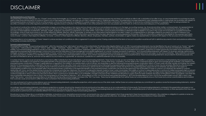 DISCLAIMER No Representations and Warranties This presentation of Gores Metropoulos, Inc. (“Gores”) and Luminar Technologies, Inc (“Luminar” or the “Company”) is for informational purposes only and does not constitute an offer to sell, a solicitation of an offer to buy, or a recommendation to purchase any equity, debt or other financial instruments of Luminar or Gores or any of their respective affiliates’ securities (as such term is defined under U.S. federal securities laws). This presentation has been prepared to assist interested parties in making their own evaluation with respect to the proposed business combination and for no other purpose. Luminar and Gores assume no obligation to update or keep current the information contained in this presentation, to remove any outdated information or to expressly mark it as being outdated. No securities commission or securities regulatory authority or other regulatory body or authority in the United States or any other jurisdiction has in any way passed upon the merits of, or the accuracy and adequacy of, this presentation. You should not construe the contents of this presentation as legal, accounting, business or tax advice and you should consult your own professional advisors as to the legal, accounting, business, tax, financial and other matters contained herein. No representation or warranty, express or implied, is or will be given by Gores nor Luminar nor any of their respective affiliates, directors, officers, employees or advisers or any other person as to the accuracy or completeness of the information in this presentation (including as to the accuracy or reasonableness of statements, estimates, targets, projections, assumptions or judgments) or any other written, oral or other communications transmitted or otherwise made available to any party in the course of its evaluation of a possible transaction. Accordingly, none of Gores and Luminar or any of their respective affiliates, directors, officers, employees, or advisers or any other person shall be liable for any direct, indirect, or consequential loss or damages suffered by any person as a result of relying on any statement in or omission from this presentation and any such liability is expressly disclaimed. Certain information contained herein has been derived from sources prepared by third parties. While such information is believed to be reliable for the purposes used herein, none of Gores’, Luminar’s, their respective affiliates, nor Gores’, Luminar’s or their respective affiliates' directors, officers, employees, members, partners, stockholders, or agents makes any representation or warranty with respect to the accuracy of such information. This presentation is not an expression of Gores’ interest in Luminar and does not constitute an offer or agreement to acquire Luminar; it being understood that the terms of any such acquisition would be set forth in definitive documents in form and substance satisfactory to the parties and executed by them. Forward-Looking Statements This presentation includes “forward-looking statements” within the meaning of the “safe harbor” provisions of the United States Private Securities Litigation Reform Act of 1995. Forward-looking statements may be identified by the use of words such as “future,” “growth,” “opportunity,” “well-positioned,” forecast, intend, seek, target, “anticipate,” “believe,” “expect,” “estimate,” “plan,” “outlook,” and “project” and other similar expressions that predict or indicate future events or trends or that are not statements of historical matters. Such forward-looking statements include, but are not limited to, projected financial information, statements regarding estimates and forecasts of other financial and performance metrics, projections of market opportunity and market share and statements regarding the proposed relationship between Luminar and Volvo and the implications of those arrangements and related agreements on Luminar’s business and results of operations. Such forward-looking statements with respect to revenues, earnings, performance, strategies, prospects and other aspects of the businesses of Gores, Luminar or the combined company after completion of any proposed business combination are based on current expectations that are subject to risks and uncertainties. These statements are based on various assumptions, whether or not identified in this presentation, and on the current expectations of Gores’ and Luminar's management and are not predictions of actual performance. These forward-looking statements are provided for illustrative purposes only and are not intended to serve as, and must not be relied on by any investor as, a guarantee, an assurance, a prediction or a definitive statement of fact or probability. A number of factors could cause actual results or outcomes to differ materially from those indicated by such forward-looking statements. These factors include, but are not limited to: the inability to complete the transactions contemplated by the proposed business combination; the inability to recognize the anticipated benefits of the proposed business combination, which may be affected by, among other things, competition, and the ability of the combined business to grow and manage growth profitably; costs related to the proposed business combination; changes in applicable laws or regulations; the inability to successfully retain or recruit officers, key employees or directors following the proposed business combination; effects of Gores' public securities' liquidity and trading; the market's reaction to the proposed business combination; the lack of a market for Gores' securities; Gores' and Luminar's financial performance following the proposed business combination; the possibility that Luminar or Gores may be adversely affected by other economic, business, and/or competitive factors, including the level of demand a