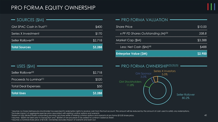 PRO FORMA EQUITY OWNERSHIP SOURCES ($M) PRO FORMA VALUATION (1) GM SPAC Cash in Trust $400 Share Price $10.00 (3) Series X Investment $170 x PF FD Shares Outstanding (M) 338.8 (2) Market Cap ($M) $3,388 Seller Rollover $2,718 (4) Less: Net Cash ($M) $488 Total Sources $3,288 Enterprise Value ($M) $2,900 (2)(3)(5) USES ($M) PRO FORMA OWNERSHIP Series X Investors (2) Seller Rollover $2,718 GM Sponsor 5.0% 3.0% (1) Proceeds to Luminar $520 GM Stockholders 11.8% Total Deal Expenses $50 Total Uses $3,288 Seller Rollover 80.2% 1 Assumes no Gores Metropoulos stockholder has exercised its redemption rights to receive cash from the trust account. This amount will be reduced by the amount of cash used to satisfy any redemptions. 2 Excludes impact of aggregate exercise price associated with existing Luminar options and warrants. 3 Based on fully diluted shares outstanding assuming net share settle of existing Luminar options and warrants at pro forma $10.00 share price. 41 4 Assumes ~$32M net debt prior to Transaction and ~$520M of net proceeds to be added to Luminar’s balance sheet. 5 Assumes a nominal share price of $10.00. Ownership excludes impact of warrants and earn-out.PRO FORMA EQUITY OWNERSHIP SOURCES ($M) PRO FORMA VALUATION (1) GM SPAC Cash in Trust $400 Share Price $10.00 (3) Series X Investment $170 x PF FD Shares Outstanding (M) 338.8 (2) Market Cap ($M) $3,388 Seller Rollover $2,718 (4) Less: Net Cash ($M) $488 Total Sources $3,288 Enterprise Value ($M) $2,900 (2)(3)(5) USES ($M) PRO FORMA OWNERSHIP Series X Investors (2) Seller Rollover $2,718 GM Sponsor 5.0% 3.0% (1) Proceeds to Luminar $520 GM Stockholders 11.8% Total Deal Expenses $50 Total Uses $3,288 Seller Rollover 80.2% 1 Assumes no Gores Metropoulos stockholder has exercised its redemption rights to receive cash from the trust account. This amount will be reduced by the amount of cash used to satisfy any redemptions. 2 Excludes impact of aggregate exercise price associated with existing Luminar options and warrants. 3 Based on fully diluted shares outstanding assuming net share settle of existing Luminar options and warrants at pro forma $10.00 share price. 41 4 Assumes ~$32M net debt prior to Transaction and ~$520M of net proceeds to be added to Luminar’s balance sheet. 5 Assumes a nominal share price of $10.00. Ownership excludes impact of warrants and earn-out.