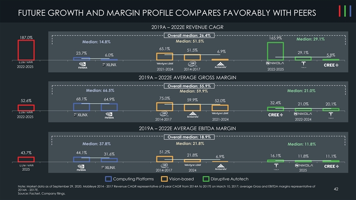 VALUATION BENCHMARKING EV / CY2021E (CY+1) REVENUE EV / CY+4 REVENUE Overall median: 8.9x Median: 12.7x Median: 13.7x Median: 8.3x 21.7x 17.9x 10.4x 7.4x 6.2x 5.9x 5.8x 3.5x 2.0x 2025 2017 2024 2024 EV / CY2021E (CY+1) EBITDA EV / CY+4 EBITDA Overall median: 40.0x Median: 30.7x Median: 54.5x 59.6x 49.4x 40.0x 38.1x 30.6x 23.3x 27.3x 7.9x NM 2025 2017 2024 2024 Computing Platforms Vision-based Disruptive Autotech Note: Luminar multiples reflect valuation at time of announcement ($2.9bn enterprise value). Market data as of September 29, 2020. Multiples less than 0.0x and over 80.0x considered “NM”. Mobileye 2017 43 reflects 2017E multiples at pre-announcement unaffected trading price as of March 10, 2017. Source: Factset, Company filings.VALUATION BENCHMARKING EV / CY2021E (CY+1) REVENUE EV / CY+4 REVENUE Overall median: 8.9x Median: 12.7x Median: 13.7x Median: 8.3x 21.7x 17.9x 10.4x 7.4x 6.2x 5.9x 5.8x 3.5x 2.0x 2025 2017 2024 2024 EV / CY2021E (CY+1) EBITDA EV / CY+4 EBITDA Overall median: 40.0x Median: 30.7x Median: 54.5x 59.6x 49.4x 40.0x 38.1x 30.6x 23.3x 27.3x 7.9x NM 2025 2017 2024 2024 Computing Platforms Vision-based Disruptive Autotech Note: Luminar multiples reflect valuation at time of announcement ($2.9bn enterprise value). Market data as of September 29, 2020. Multiples less than 0.0x and over 80.0x considered “NM”. Mobileye 2017 43 reflects 2017E multiples at pre-announcement unaffected trading price as of March 10, 2017. Source: Factset, Company filings.
