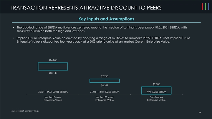 TRANSACTION REPRESENTS ATTRACTIVE DISCOUNT TO PEERS Key Inputs and Assumptions • The applied range of EBITDA multiples are centered around the median of Luminar’s peer group 40.0x 2021 EBITDA, with sensitivity built in on both the high and low ends. • Implied Future Enterprise Value calculated by applying a range of multiples to Luminar’s 2025E EBITDA. That Implied Future Enterprise Value is discounted four years back at a 20% rate to arrive at an Implied Current Enterprise Value. $16,060 $13,140 $7,745 $2,900 $6,337 36.0x – 44.0x 2025E EBITDA 36.0x – 44.0x 2025E EBITDA 7.9x 2025E EBITDA Implied Future Implied Current Post-Money Enterprise Value Enterprise Value Enterprise Value Source: Factset, Company filings. 44TRANSACTION REPRESENTS ATTRACTIVE DISCOUNT TO PEERS Key Inputs and Assumptions • The applied range of EBITDA multiples are centered around the median of Luminar’s peer group 40.0x 2021 EBITDA, with sensitivity built in on both the high and low ends. • Implied Future Enterprise Value calculated by applying a range of multiples to Luminar’s 2025E EBITDA. That Implied Future Enterprise Value is discounted four years back at a 20% rate to arrive at an Implied Current Enterprise Value. $16,060 $13,140 $7,745 $2,900 $6,337 36.0x – 44.0x 2025E EBITDA 36.0x – 44.0x 2025E EBITDA 7.9x 2025E EBITDA Implied Future Implied Current Post-Money Enterprise Value Enterprise Value Enterprise Value Source: Factset, Company filings. 44