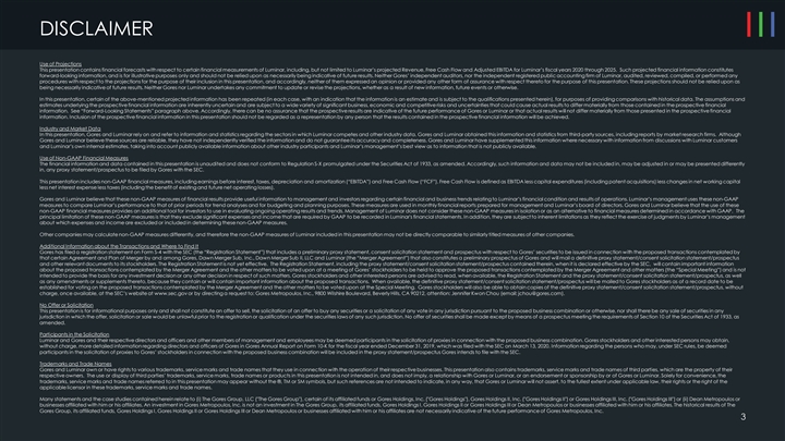DISCLAIMER Use of Projections This presentation contains financial forecasts with respect to certain financial measurements of Luminar, including, but not limited to Luminar’s projected Revenue, Free Cash Flow and Adjusted EBITDA for Luminar’s fiscal years 2020 through 2025. Such projected financial information constitutes forward-looking information, and is for illustrative purposes only and should not be relied upon as necessarily being indicative of future results. Neither Gores’ independent auditors, nor the independent registered public accounting firm of Luminar, audited, reviewed, compiled, or performed any procedures with respect to the projections for the purpose of their inclusion in this presentation, and accordingly, neither of them expressed an opinion or provided any other form of assurance with respect thereto for the purpose of this presentation. These projections should not be relied upon as being necessarily indicative of future results. Neither Gores nor Luminar undertakes any commitment to update or revise the projections, whether as a result of new information, future events or otherwise. In this presentation, certain of the above-mentioned projected information has been repeated (in each case, with an indication that the information is an estimate and is subject to the qualifications presented herein), for purposes of providing comparisons with historical data. The assumptions and estimates underlying the prospective financial information are inherently uncertain and are subject to a wide variety of significant business, economic and competitive risks and uncertainties that could cause actual results to differ materially from those contained in the prospective financial information. See “Forward-Looking Statements” paragraph above. Accordingly, there can be no assurance that the prospective results are indicative of the future performance of Gores or Luminar or that actual results will not differ materially from those presented in the prospective financial information. Inclusion of the prospective financial information in this presentation should not be regarded as a representation by any person that the results contained in the prospective financial information will be achieved. Industry and Market Data In this presentation, Gores and Luminar rely on and refer to information and statistics regarding the sectors in which Luminar competes and other industry data. Gores and Luminar obtained this information and statistics from third-party sources, including reports by market research firms. Although Gores and Luminar believe these sources are reliable, they have not independently verified the information and do not guarantee its accuracy and completeness. Gores and Luminar have supplemented this information where necessary with information from discussions with Luminar customers and Luminar’s own internal estimates, taking into account publicly available information about other industry participants and Luminar’s management’s best view as to information that is not publicly available. Use of Non-GAAP Financial Measures The financial information and data contained in this presentation is unaudited and does not conform to Regulation S-X promulgated under the Securities Act of 1933, as amended. Accordingly, such information and data may not be included in, may be adjusted in or may be presented differently in, any proxy statement/prospectus to be filed by Gores with the SEC. This presentation includes non-GAAP financial measures, including earnings before interest, taxes, depreciation and amortization (“EBITDA”) and Free Cash Flow (“FCF”). Free Cash Flow is defined as EBITDA less capital expenditures (including patent acquisitions) less changes in net working capital less net interest expense less taxes (including the benefit of existing and future net operating losses). Gores and Luminar believe that these non-GAAP measures of financial results provide useful information to management and investors regarding certain financial and business trends relating to Luminar’s financial condition and results of operations. Luminar’s management uses these non-GAAP measures to compare Luminar’s performance to that of prior periods for trend analyses and for budgeting and planning purposes. These measures are used in monthly financial reports prepared for management and Luminar’s board of directors. Gores and Luminar believe that the use of these non-GAAP financial measures provides an additional tool for investors to use in evaluating ongoing operating results and trends. Management of Luminar does not consider these non-GAAP measures in isolation or as an alternative to financial measures determined in accordance with GAAP. The principal limitation of these non-GAAP measures is that they exclude significant expenses and income that are required by GAAP to be recorded in Luminar's financial statements. In addition, they are subject to inherent limitations as they reflect the exercise of judgments by Luminar’s management about which expenses and income are excluded or included in determining these non-GAAP measures. Other companies may calculate non-GAAP measures differently, and therefore the non-GAAP measures of Luminar included in this presentation may not be directly comparable to similarly titled measures of other companies. Additional Information about the Transactions and Where to Find It Gores has filed a registration statement on Form S-4 with the SEC (the “Registration Statement”) that includes a preliminary proxy statement, consent solicitation statement and prospectus with respect to Gores’ securities to be issued in connection with the proposed transactions contemplated by that certain Agreement and Plan of Merger by and among Gores, Dawn Merger Sub, Inc., Dawn Merger Sub II, LLC and Luminar (the “Merger Agreement”) that also constitutes a preliminary prospectus of Gores and will mail a definitive proxy statement/consent solic