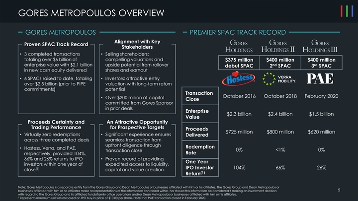 GORES METROPOULOS OVERVIEW GORES METROPOULOS PREMIER SPAC TRACK RECORD Alignment with Key Proven SPAC Track Record Stakeholders • 3 completed transactions • Selling shareholders: totaling over $6 billion of compelling valuations and $375 million $400 million $400 million nd rd enterprise value with $2.1 billion upside potential from rollover debut SPAC 2 SPAC 3 SPAC in new cash equity delivered shares and earnout • 6 SPACs raised to date, totaling • Investors: attractive entry over $2.5 billion (prior to PIPE valuation with long-term return commitments) potential Transaction October 2016 October 2018 February 2020 • Over $200 million of capital Close committed from Gores Sponsor in prior deals Enterprise $2.3 billion $2.4 billion $1.5 billion Value Proceeds Certainty and An Attractive Opportunity Trading Performance for Prospective Targets Proceeds $725 million $800 million $620 million • Virtually zero redemptions • Significant experience ensures Delivered across three completed deals seamless transaction from upfront diligence through Redemption • Hostess, Verra, and PAE, 0% <1% 0% transaction close Rate respectively, provided 104%, 66% and 26% returns to IPO • Proven record of providing One Year investors within one year of expedited access to liquidity, IPO Investor 104% 66% 26% (1) close capital and value creation (1) Return Note: Gores Metropoulos is a separate entity from The Gores Group and Dean Metropoulos or businesses affiliated with him or his affiliates. The Gores Group and Dean Metropoulos or 5 businesses affiliated with him or his affiliates make no representations of the information contained within, nor should this information be considered if making an investment decision with regard to The Gores Group and its affiliated funds/family office operations and/or Dean Metropoulos or businesses affiliated with him or his affiliates. 1 Represents maximum unit return based on IPO buy-in price of $10.00 per share. Note that PAE transaction closed in February 2020.GORES METROPOULOS OVERVIEW GORES METROPOULOS PREMIER SPAC TRACK RECORD Alignment with Key Proven SPAC Track Record Stakeholders • 3 completed transactions • Selling shareholders: totaling over $6 billion of compelling valuations and $375 million $400 million $400 million nd rd enterprise value with $2.1 billion upside potential from rollover debut SPAC 2 SPAC 3 SPAC in new cash equity delivered shares and earnout • 6 SPACs raised to date, totaling • Investors: attractive entry over $2.5 billion (prior to PIPE valuation with long-term return commitments) potential Transaction October 2016 October 2018 February 2020 • Over $200 million of capital Close committed from Gores Sponsor in prior deals Enterprise $2.3 billion $2.4 billion $1.5 billion Value Proceeds Certainty and An Attractive Opportunity Trading Performance for Prospective Targets Proceeds $725 million $800 million $620 million • Virtually zero redemptions • Significant experience ensures Delivered across three completed deals seamless transaction from upfront diligence through Redemption • Hostess, Verra, and PAE, 0% <1% 0% transaction close Rate respectively, provided 104%, 66% and 26% returns to IPO • Proven record of providing One Year investors within one year of expedited access to liquidity, IPO Investor 104% 66% 26% (1) close capital and value creation (1) Return Note: Gores Metropoulos is a separate entity from The Gores Group and Dean Metropoulos or businesses affiliated with him or his affiliates. The Gores Group and Dean Metropoulos or 5 businesses affiliated with him or his affiliates make no representations of the information contained within, nor should this information be considered if making an investment decision with regard to The Gores Group and its affiliated funds/family office operations and/or Dean Metropoulos or businesses affiliated with him or his affiliates. 1 Represents maximum unit return based on IPO buy-in price of $10.00 per share. Note that PAE transaction closed in February 2020.