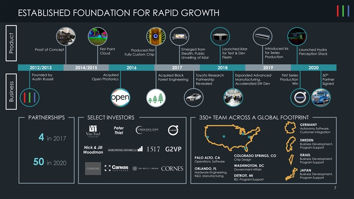 ESTABLISHED FOUNDATION FOR RAPID GROWTH Introduced Iris First Point Launched lidar Proof of Concept Emerged from Launched Hydra Produced First for Series Cloud Stealth; Public for Test & Dev Perception Stack Fully Custom Chip Production Fleets Unveiling of lidar 2012/2013 2014/2015 2016 2017 2018 2019 2020 th Founded by Acquired Acquired Black Toyota Research Expanded Advanced First Series 50 Austin Russell Open Photonics Forest Engineering Partnership Manufacturing, Production Partner Revealed Accelerated SW Dev Win Signed PARTNERSHIPS SELECT INVESTORS 350+ TEAM ACROSS A GLOBAL FOOTPRINT GERMANY Peter Autonomy Software, Customer Integration Thiel 4 in 2017 SWEDEN Business Development, Nick & Jill Program Support Woodman ISRAEL COLORADO SPRINGS, CO PALO ALTO, CA Business Development, Chip Design Operations, Software Program Support 50 in 2020 WASHINGTON, DC ORLANDO, FL Government Affairs JAPAN Hardware Engineering, Business Development, R&D, Manufacturing DETROIT, MI Program Support BD, Program Support 7 Business ProductESTABLISHED FOUNDATION FOR RAPID GROWTH Introduced Iris First Point Launched lidar Proof of Concept Emerged from Launched Hydra Produced First for Series Cloud Stealth; Public for Test & Dev Perception Stack Fully Custom Chip Production Fleets Unveiling of lidar 2012/2013 2014/2015 2016 2017 2018 2019 2020 th Founded by Acquired Acquired Black Toyota Research Expanded Advanced First Series 50 Austin Russell Open Photonics Forest Engineering Partnership Manufacturing, Production Partner Revealed Accelerated SW Dev Win Signed PARTNERSHIPS SELECT INVESTORS 350+ TEAM ACROSS A GLOBAL FOOTPRINT GERMANY Peter Autonomy Software, Customer Integration Thiel 4 in 2017 SWEDEN Business Development, Nick & Jill Program Support Woodman ISRAEL COLORADO SPRINGS, CO PALO ALTO, CA Business Development, Chip Design Operations, Software Program Support 50 in 2020 WASHINGTON, DC ORLANDO, FL Government Affairs JAPAN Hardware Engineering, Business Development, R&D, Manufacturing DETROIT, MI Program Support BD, Program Support 7 Business Product