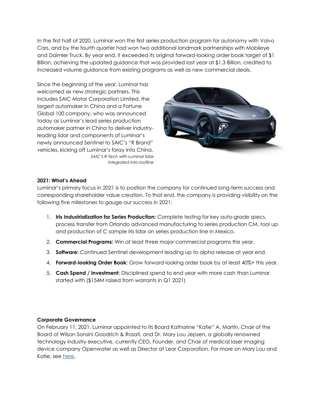 In the first half of 2020, Luminar won the first series production program for autonomy with Volvo Cars, and by the fourth quarter had won two additional landmark partnerships with Mobileye and Daimler Truck. By year end, it exceeded its original forward-looking order book target of $1 Billion, achieving the updated guidance that was provided last year at $1.3 Billion, credited to increased volume guidance from existing programs as well as new commercial deals. Since the beginning of the year, Luminar has welcomed six new strategic partners. This includes SAIC Motor Corporation Limited, the largest automaker in China and a Fortune Global 100 company, who was announced today as Luminar’s lead series production automaker partner in China to deliver industry- leading lidar and components of Luminar’s newly announced Sentinel to SAIC’s “R Brand” vehicles, kicking off Luminar’s foray into China. SAIC’s R-Tech with Luminar lidar integrated into roofline 2021: What’s Ahead Luminar’s primary focus in 2021 is to position the company for continued long-term success and corresponding shareholder value creation. To that end, the company is providing visibility on the following five milestones to gauge our success in 2021: 1. Iris Industrialization for Series Production: Complete testing for key auto-grade specs, process transfer from Orlando advanced manufacturing to series production CM, tool up and production of C sample Iris lidar on series production line in Mexico. 2. Commercial Programs: Win at least three major commercial programs this year. 3. Software: Continued Sentinel development leading up to alpha release at year end. 4. Forward-looking Order Book: Grow forward-looking order book by at least 40%+ this year. 5. Cash Spend / Investment: Disciplined spend to end year with more cash than Luminar started with ($154M raised from warrants in Q1 2021) Corporate Governance On February 11, 2021, Luminar appointed to its Board Katharine “Katie” A. Martin, Chair of the Board of Wilson Sonsini Goodrich & Rosati, and Dr. Mary Lou Jepsen, a globally renowned technology industry executive, currently CEO, Founder, and Chair of medical laser imaging device company Openwater as well as Director at Lear Corporation. For more on Mary Lou and Katie, see here.