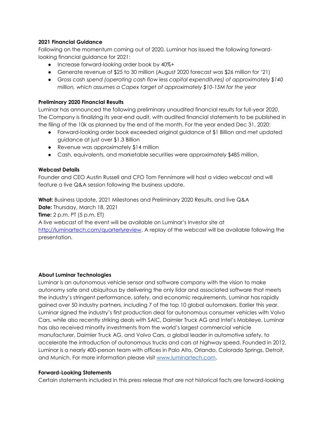 2021 Financial Guidance Following on the momentum coming out of 2020, Luminar has issued the following forward- looking financial guidance for 2021: ● Increase forward-looking order book by 40%+ ● Generate revenue of $25 to 30 million (August 2020 forecast was $26 million for ‘21) ● Gross cash spend (operating cash flow less capital expenditures) of approximately $140 million, which assumes a Capex target of approximately $10-15M for the year Preliminary 2020 Financial Results Luminar has announced the following preliminary unaudited financial results for full-year 2020. The Company is finalizing its year-end audit, with audited financial statements to be published in the filing of the 10k as planned by the end of the month. For the year ended Dec 31, 2020: ● Forward-looking order book exceeded original guidance of $1 Billion and met updated guidance at just over $1.3 Billion ● Revenue was approximately $14 million ● Cash, equivalents, and marketable securities were approximately $485 million. Webcast Details Founder and CEO Austin Russell and CFO Tom Fennimore will host a video webcast and will feature a live Q&A session following the business update. What: Business Update, 2021 Milestones and Preliminary 2020 Results, and live Q&A Date: Thursday, March 18, 2021 Time: 2 p.m. PT (5 p.m. ET) A live webcast of the event will be available on Luminar’s Investor site at http://luminartech.com/quarterlyreview. A replay of the webcast will be available following the presentation. About Luminar Technologies Luminar is an autonomous vehicle sensor and software company with the vision to make autonomy safe and ubiquitous by delivering the only lidar and associated software that meets the industry’s stringent performance, safety, and economic requirements. Luminar has rapidly gained over 50 industry partners, including 7 of the top 10 global automakers. Earlier this year, Luminar signed the industry’s first production deal for autonomous consumer vehicles with Volvo Cars, while also recently striking deals with SAIC, Daimler Truck AG and Intel’s Mobileye. Luminar has also received minority investments from the world’s largest commercial vehicle manufacturer, Daimler Truck AG, and Volvo Cars, a global leader in automotive safety, to accelerate the introduction of autonomous trucks and cars at highway speed. Founded in 2012, Luminar is a nearly 400-person team with offices in Palo Alto, Orlando, Colorado Springs, Detroit, and Munich. For more information please visit www.luminartech.com. Forward-Looking Statements Certain statements included in this press release that are not historical facts are forward-looking