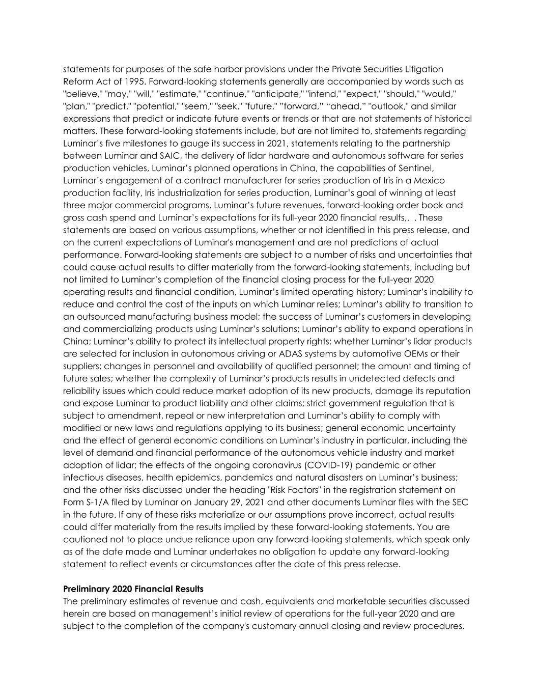 statements for purposes of the safe harbor provisions under the Private Securities Litigation Reform Act of 1995. Forward-looking statements generally are accompanied by words such as "believe," "may," "will," "estimate," "continue," "anticipate," "intend," "expect," "should," "would," "plan," "predict," "potential," "seem," "seek," "future," ”forward,” “ahead,” "outlook," and similar expressions that predict or indicate future events or trends or that are not statements of historical matters. These forward-looking statements include, but are not limited to, statements regarding Luminar’s five milestones to gauge its success in 2021, statements relating to the partnership between Luminar and SAIC, the delivery of lidar hardware and autonomous software for series production vehicles, Luminar’s planned operations in China, the capabilities of Sentinel, Luminar’s engagement of a contract manufacturer for series production of Iris in a Mexico production facility, Iris industrialization for series production, Luminar’s goal of winning at least three major commercial programs, Luminar’s future revenues, forward-looking order book and gross cash spend and Luminar’s expectations for its full-year 2020 financial results,. . These statements are based on various assumptions, whether or not identified in this press release, and on the current expectations of Luminar's management and are not predictions of actual performance. Forward-looking statements are subject to a number of risks and uncertainties that could cause actual results to differ materially from the forward-looking statements, including but not limited to Luminar’s completion of the financial closing process for the full-year 2020 operating results and financial condition, Luminar’s limited operating history; Luminar’s inability to reduce and control the cost of the inputs on which Luminar relies; Luminar’s ability to transition to an outsourced manufacturing business model; the success of Luminar’s customers in developing and commercializing products using Luminar’s solutions; Luminar’s ability to expand operations in China; Luminar’s ability to protect its intellectual property rights; whether Luminar’s lidar products are selected for inclusion in autonomous driving or ADAS systems by automotive OEMs or their suppliers; changes in personnel and availability of qualified personnel; the amount and timing of future sales; whether the complexity of Luminar’s products results in undetected defects and reliability issues which could reduce market adoption of its new products, damage its reputation and expose Luminar to product liability and other claims; strict government regulation that is subject to amendment, repeal or new interpretation and Luminar’s ability to comply with modified or new laws and regulations applying to its business; general economic uncertainty and the effect of general economic conditions on Luminar’s industry in particular, including the level of demand and financial performance of the autonomous vehicle industry and market adoption of lidar; the effects of the ongoing coronavirus (COVID-19) pandemic or other infectious diseases, health epidemics, pandemics and natural disasters on Luminar’s business; and the other risks discussed under the heading "Risk Factors" in the registration statement on Form S-1/A filed by Luminar on January 29, 2021 and other documents Luminar files with the SEC in the future. If any of these risks materialize or our assumptions prove incorrect, actual results could differ materially from the results implied by these forward-looking statements. You are cautioned not to place undue reliance upon any forward-looking statements, which speak only as of the date made and Luminar undertakes no obligation to update any forward-looking statement to reflect events or circumstances after the date of this press release. Preliminary 2020 Financial Results The preliminary estimates of revenue and cash, equivalents and marketable securities discussed herein are based on management’s initial review of operations for the full-year 2020 and are subject to the completion of the company's customary annual closing and review procedures.