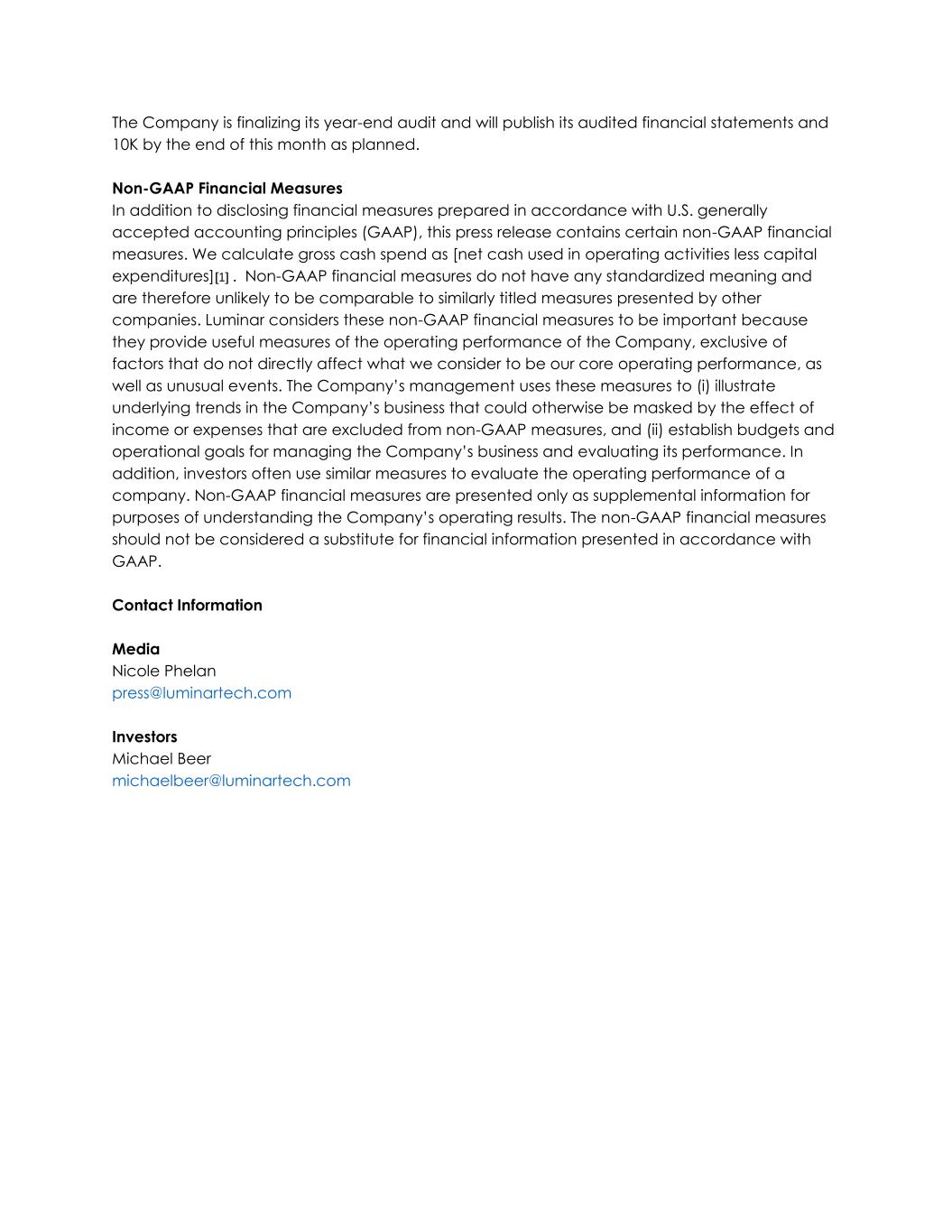 The Company is finalizing its year-end audit and will publish its audited financial statements and 10K by the end of this month as planned. Non-GAAP Financial Measures In addition to disclosing financial measures prepared in accordance with U.S. generally accepted accounting principles (GAAP), this press release contains certain non-GAAP financial measures. We calculate gross cash spend as [net cash used in operating activities less capital expenditures][1] . Non-GAAP financial measures do not have any standardized meaning and are therefore unlikely to be comparable to similarly titled measures presented by other companies. Luminar considers these non-GAAP financial measures to be important because they provide useful measures of the operating performance of the Company, exclusive of factors that do not directly affect what we consider to be our core operating performance, as well as unusual events. The Company’s management uses these measures to (i) illustrate underlying trends in the Company’s business that could otherwise be masked by the effect of income or expenses that are excluded from non-GAAP measures, and (ii) establish budgets and operational goals for managing the Company’s business and evaluating its performance. In addition, investors often use similar measures to evaluate the operating performance of a company. Non-GAAP financial measures are presented only as supplemental information for purposes of understanding the Company’s operating results. The non-GAAP financial measures should not be considered a substitute for financial information presented in accordance with GAAP. Contact Information Media Nicole Phelan press@luminartech.com Investors Michael Beer michaelbeer@luminartech.com