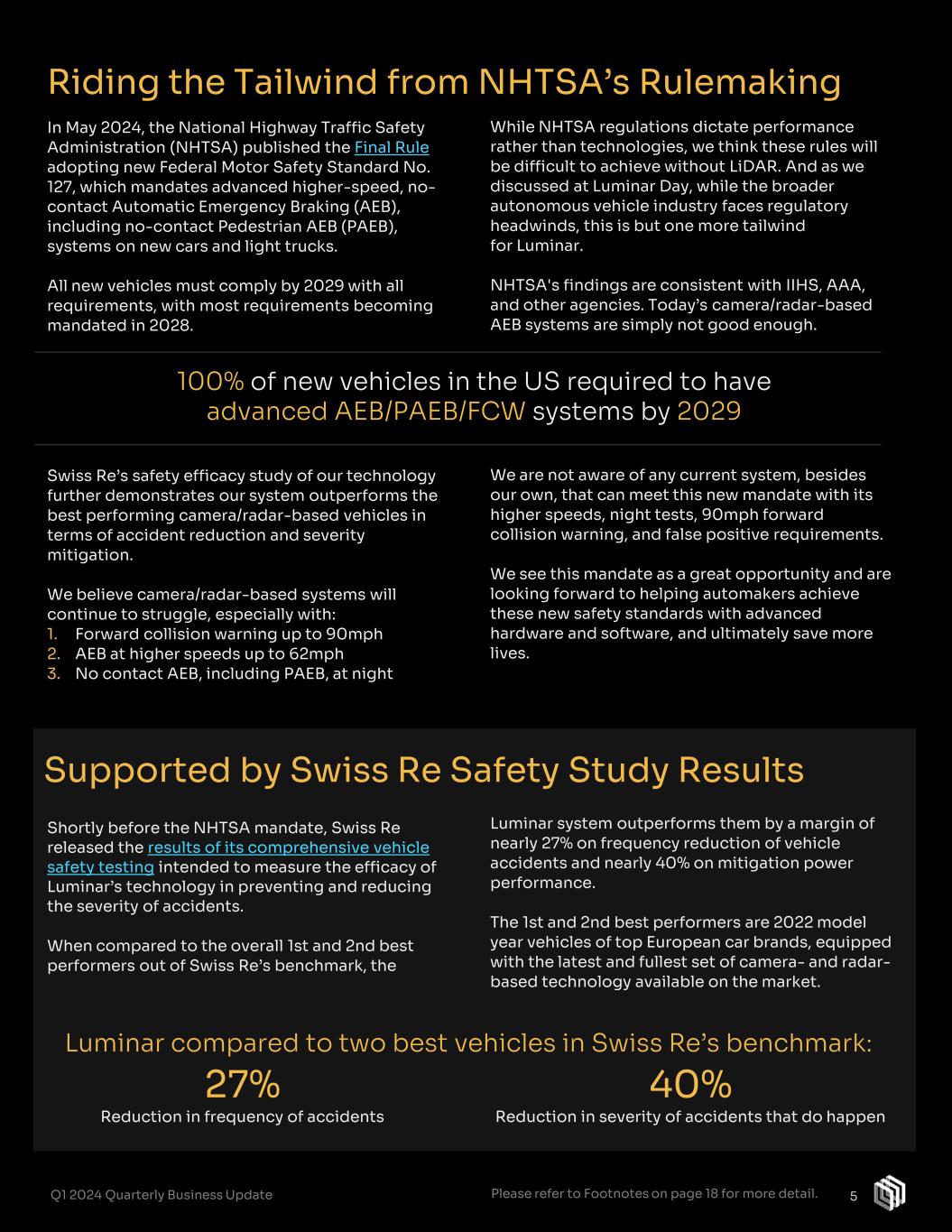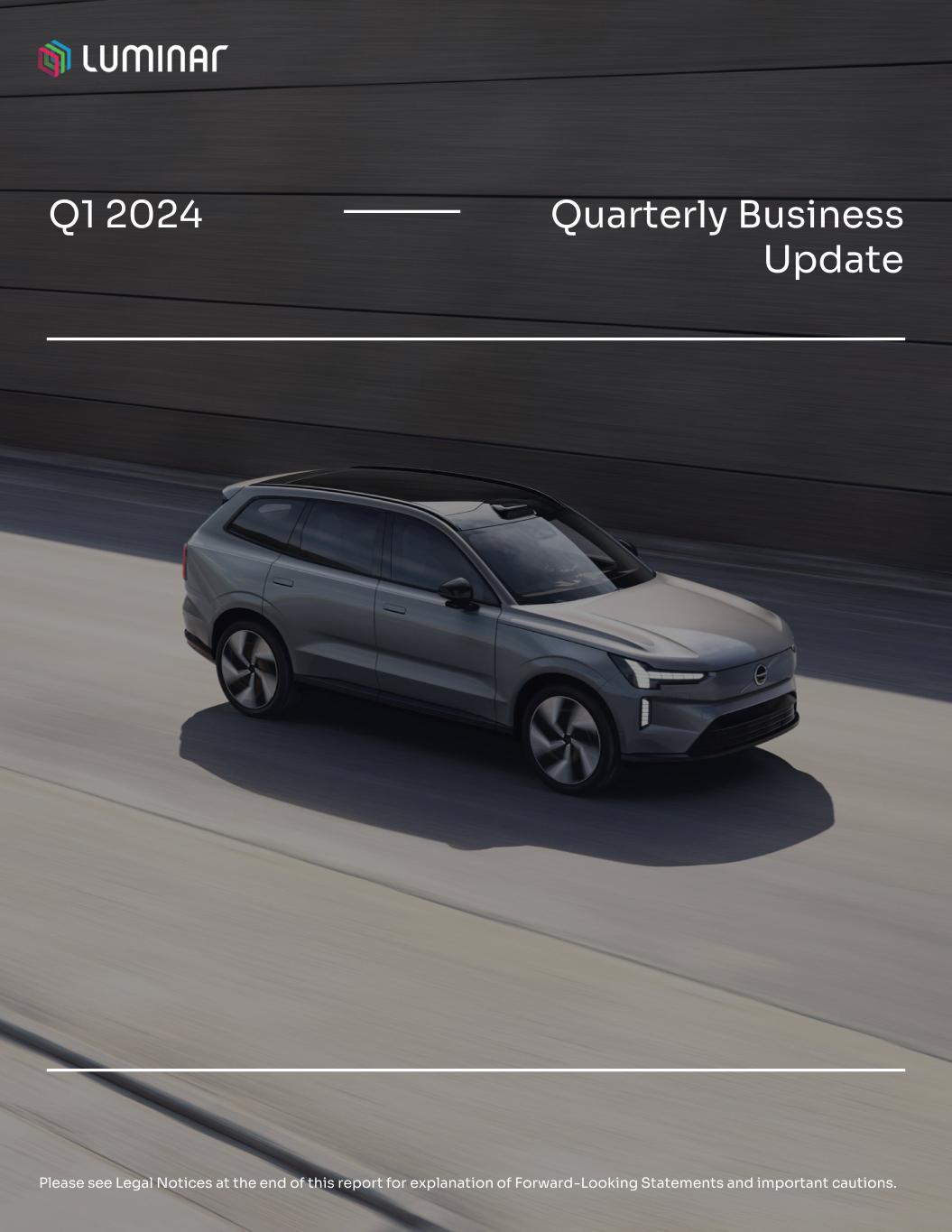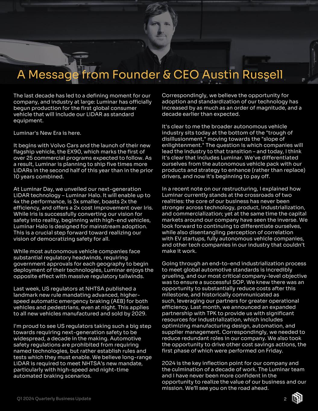 2 The last decade has led to a defining moment for our company, and industry at large: Luminar has officially begun production for the first global consumer vehicle that will include our LiDAR as standard equipment. Luminar's New Era is here. It begins with Volvo Cars and the launch of their new flagship vehicle, the EX90, which marks the first of over 25 commercial programs expected to follow. As a result, Luminar is planning to ship five times more LiDARs in the second half of this year than in the prior 10 years combined. At Luminar Day, we unveiled our next-generation LiDAR technology – Luminar Halo. It will enable up to 4x the performance, is 3x smaller, boasts 2x the efficiency, and offers a 2x cost improvement over Iris. While Iris is successfully converting our vision for safety into reality, beginning with high-end vehicles, Luminar Halo is designed for mainstream adoption. This is a crucial step forward toward realizing our vision of democratizing safety for all. While most autonomous vehicle companies face substantial regulatory headwinds, requiring government approvals for each geography to begin deployment of their technologies, Luminar enjoys the opposite effect with massive regulatory tailwinds. Last week, US regulators at NHTSA published a landmark new rule mandating advanced, higher- speed automatic emergency braking (AEB) for both vehicles and pedestrians, even at night. This applies to all new vehicles manufactured and sold by 2029. I'm proud to see US regulators taking such a big step towards requiring next-generation safety to be widespread, a decade in the making. Automotive safety regulations are prohibited from requiring named technologies, but rather establish rules and tests which they must enable. We believe long-range LiDAR is required to meet NHTSA’s new mandate, particularly with high-speed and night-time automated braking scenarios. Correspondingly, we believe the opportunity for adoption and standardization of our technology has increased by as much as an order of magnitude, and a decade earlier than expected. It's clear to me the broader autonomous vehicle industry sits today at the bottom of the "trough of disillusionment," moving towards the "slope of enlightenment." The question is which companies will lead the industry to that transition – and today, I think it's clear that includes Luminar. We've differentiated ourselves from the autonomous vehicle pack with our products and strategy to enhance (rather than replace) drivers, and now it's beginning to pay off. In a recent note on our restructuring, I explained how Luminar currently stands at the crossroads of two realities: the core of our business has never been stronger across technology, product, industrialization, and commercialization; yet at the same time the capital markets around our company have seen the inverse. We look forward to continuing to differentiate ourselves, while also disentangling perception of correlation with EV startups, fully autonomous vehicle companies, and other tech companies in our industry that couldn't make it work. Going through an end-to-end industrialization process to meet global automotive standards is incredibly grueling, and our most critical company-level objective was to ensure a successful SOP. We knew there was an opportunity to substantially reduce costs after this milestone, and historically communicated as such, leveraging our partners for greater operational efficiency. Last month, we announced an expanded partnership with TPK to provide us with significant resources for industrialization, which includes optimizing manufacturing design, automation, and supplier management. Correspondingly, we needed to reduce redundant roles in our company. We also took the opportunity to drive other cost savings actions, the first phase of which were performed on Friday. 2024 is the key inflection point for our company and the culmination of a decade of work. The Luminar team and I have never been more confident in the opportunity to realize the value of our business and our mission. We’ll see you on the road ahead. A Message from Founder & CEO Austin Russell Q1 2024 Quarterly Business Update
