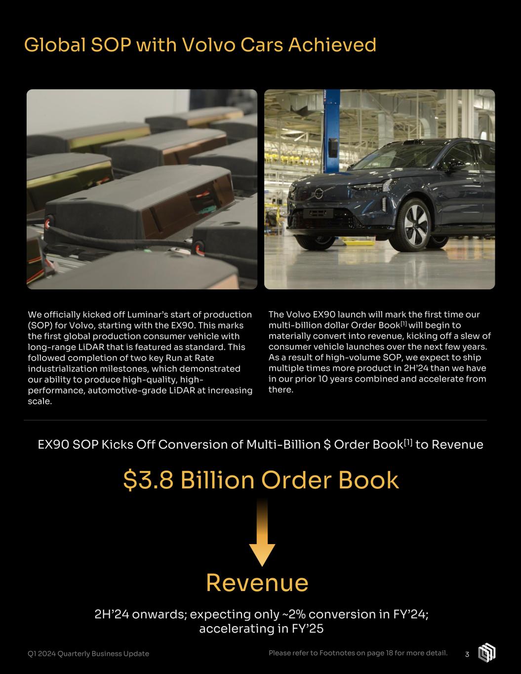 Global SOP with Volvo Cars Achieved EX90 SOP Kicks Off Conversion of Multi-Billion $ Order Book[1] to Revenue The Volvo EX90 launch will mark the first time our multi-billion dollar Order Book[1] will begin to materially convert into revenue, kicking off a slew of consumer vehicle launches over the next few years. As a result of high-volume SOP, we expect to ship multiple times more product in 2H’24 than we have in our prior 10 years combined and accelerate from there. We officially kicked off Luminar’s start of production (SOP) for Volvo, starting with the EX90. This marks the first global production consumer vehicle with long-range LiDAR that is featured as standard. This followed completion of two key Run at Rate industrialization milestones, which demonstrated our ability to produce high-quality, high- performance, automotive-grade LiDAR at increasing scale. $3.8 Billion Order Book Revenue 2H’24 onwards; expecting only ~2% conversion in FY’24; accelerating in FY’25 3Please refer to Footnotes on page 18 for more detail. Q1 2024 Quarterly Business Update