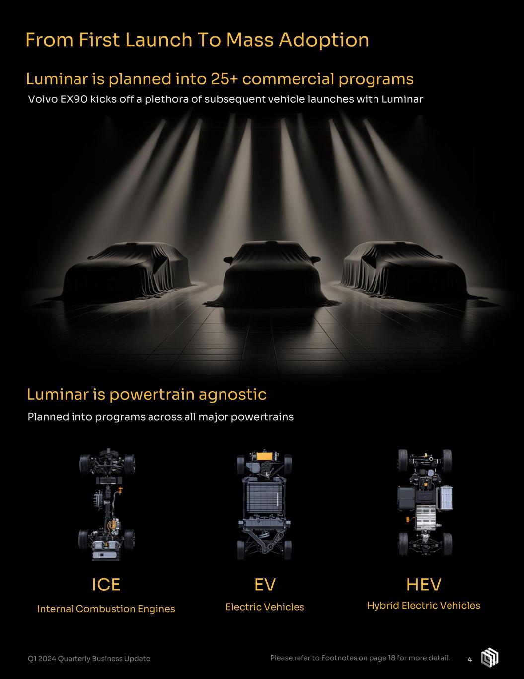 ICE Internal Combustion Engines HEV Hybrid Electric Vehicles EV Electric Vehicles Luminar is planned into 25+ commercial programs Luminar is powertrain agnostic Volvo EX90 kicks off a plethora of subsequent vehicle launches with Luminar Planned into programs across all major powertrains From First Launch To Mass Adoption 4Please refer to Footnotes on page 18 for more detail. Q1 2024 Quarterly Business Update