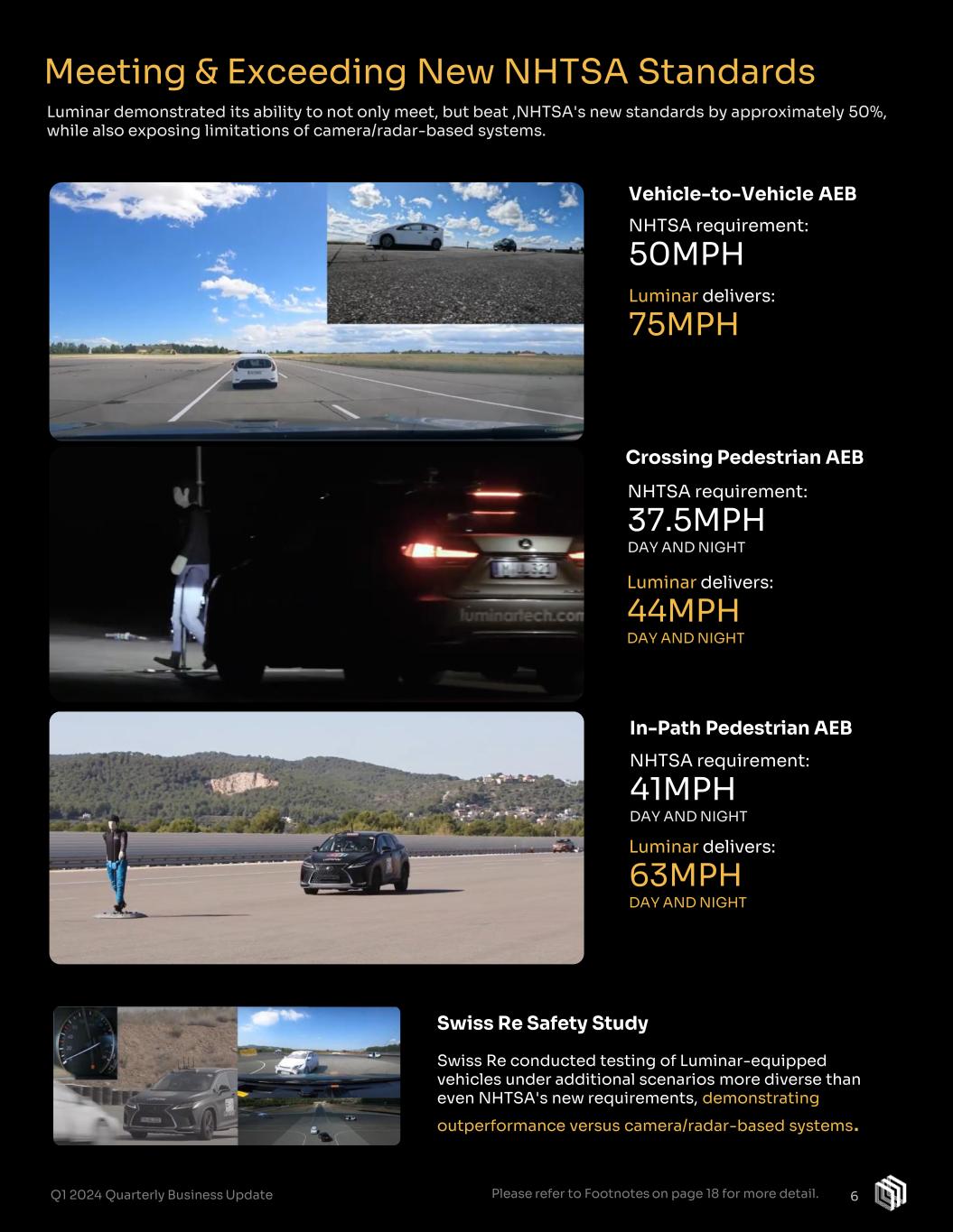 Riding the Tailwind from NHTSA’s Rulemaking While NHTSA regulations dictate performance rather than technologies, we think these rules will be difficult to achieve without LiDAR. And as we discussed at Luminar Day, while the broader autonomous vehicle industry faces regulatory headwinds, this is but one more tailwind for Luminar. NHTSA's findings are consistent with IIHS, AAA, and other agencies. Today’s camera/radar-based AEB systems are simply not good enough. We are not aware of any current system, besides our own, that can meet this new mandate with its higher speeds, night tests, 90mph forward collision warning, and false positive requirements. We see this mandate as a great opportunity and are looking forward to helping automakers achieve these new safety standards with advanced hardware and software, and ultimately save more lives. Luminar system outperforms them by a margin of nearly 27% on frequency reduction of vehicle accidents and nearly 40% on mitigation power performance. The 1st and 2nd best performers are 2022 model year vehicles of top European car brands, equipped with the latest and fullest set of camera- and radar- based technology available on the market. In May 2024, the National Highway Traffic Safety Administration (NHTSA) published the Final Rule adopting new Federal Motor Safety Standard No. 127, which mandates advanced higher-speed, no- contact Automatic Emergency Braking (AEB), including no-contact Pedestrian AEB (PAEB), systems on new cars and light trucks. All new vehicles must comply by 2029 with all requirements, with most requirements becoming mandated in 2028. Swiss Re’s safety efficacy study of our technology further demonstrates our system outperforms the best performing camera/radar-based vehicles in terms of accident reduction and severity mitigation. We believe camera/radar-based systems will continue to struggle, especially with: 1. Forward collision warning up to 90mph 2. AEB at higher speeds up to 62mph 3. No contact AEB, including PAEB, at night Shortly before the NHTSA mandate, Swiss Re released the results of its comprehensive vehicle safety testing intended to measure the efficacy of Luminar’s technology in preventing and reducing the severity of accidents. When compared to the overall 1st and 2nd best performers out of Swiss Re’s benchmark, the 100% of new vehicles in the US required to have advanced AEB/PAEB/FCW systems by 2029 5 Supported by Swiss Re Safety Study Results 27% Reduction in frequency of accidents 40% Reduction in severity of accidents that do happen Luminar compared to two best vehicles in Swiss Re’s benchmark: Please refer to Footnotes on page 18 for more detail. Q1 2024 Quarterly Business Update