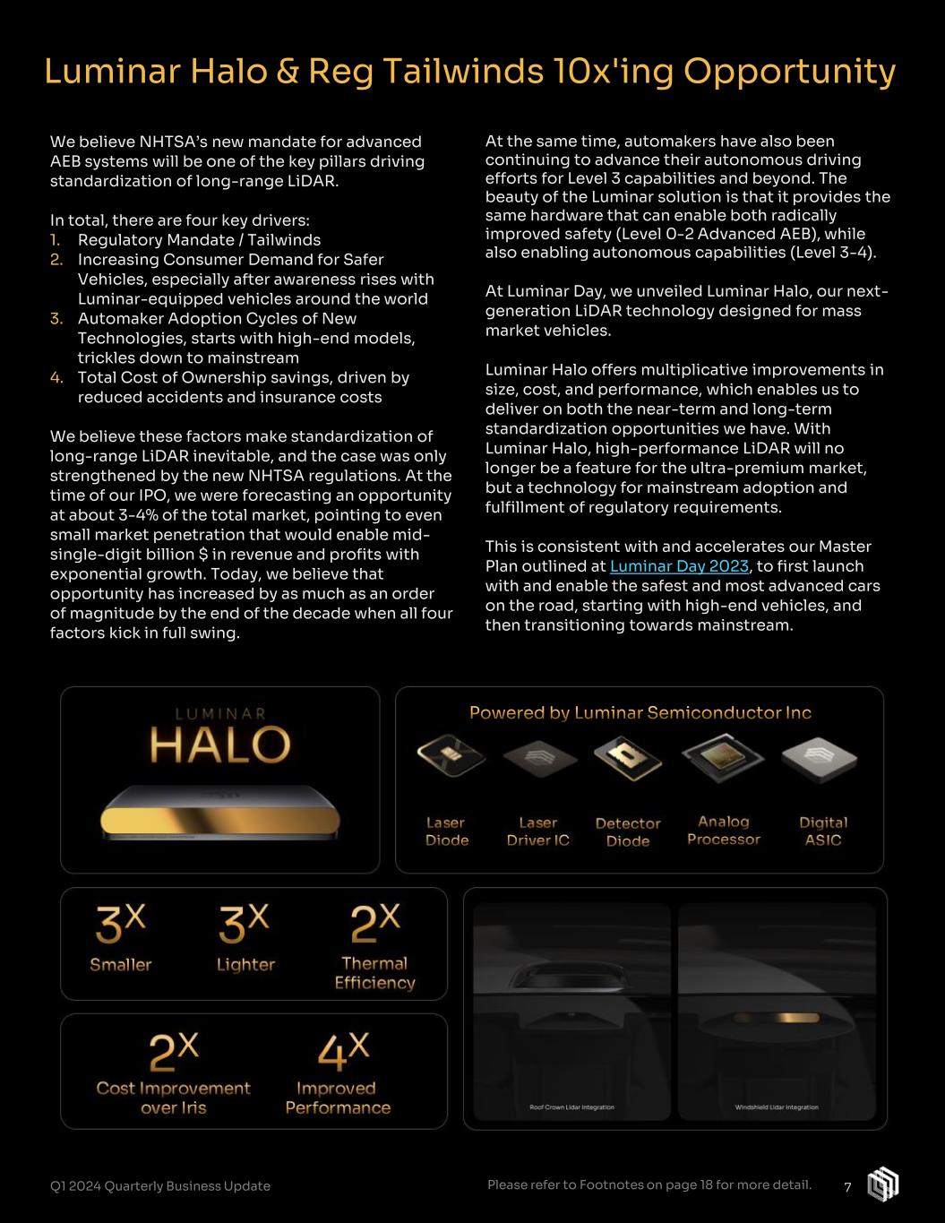 At the same time, automakers have also been continuing to advance their autonomous driving efforts for Level 3 capabilities and beyond. The beauty of the Luminar solution is that it provides the same hardware that can enable both radically improved safety (Level 0-2 Advanced AEB), while also enabling autonomous capabilities (Level 3-4). At Luminar Day, we unveiled Luminar Halo, our next- generation LiDAR technology designed for mass market vehicles. Luminar Halo offers multiplicative improvements in size, cost, and performance, which enables us to deliver on both the near-term and long-term standardization opportunities we have. With Luminar Halo, high-performance LiDAR will no longer be a feature for the ultra-premium market, but a technology for mainstream adoption and fulfillment of regulatory requirements. This is consistent with and accelerates our Master Plan outlined at Luminar Day 2023, to first launch with and enable the safest and most advanced cars on the road, starting with high-end vehicles, and then transitioning towards mainstream. We believe NHTSA’s new mandate for advanced AEB systems will be one of the key pillars driving standardization of long-range LiDAR. In total, there are four key drivers: 1. Regulatory Mandate / Tailwinds 2. Increasing Consumer Demand for Safer Vehicles, especially after awareness rises with Luminar-equipped vehicles around the world 3. Automaker Adoption Cycles of New Technologies, starts with high-end models, trickles down to mainstream 4. Total Cost of Ownership savings, driven by reduced accidents and insurance costs We believe these factors make standardization of long-range LiDAR inevitable, and the case was only strengthened by the new NHTSA regulations. At the time of our IPO, we were forecasting an opportunity at about 3-4% of the total market, pointing to even small market penetration that would enable mid- single-digit billion $ in revenue and profits with exponential growth. Today, we believe that opportunity has increased by as much as an order of magnitude by the end of the decade when all four factors kick in full swing. 7 Powered by Luminar Semiconductor Inc Please refer to Footnotes on page 18 for more detail. Q1 2024 Quarterly Business Update Luminar Halo & Reg Tailwinds 10x'ing Opportunity