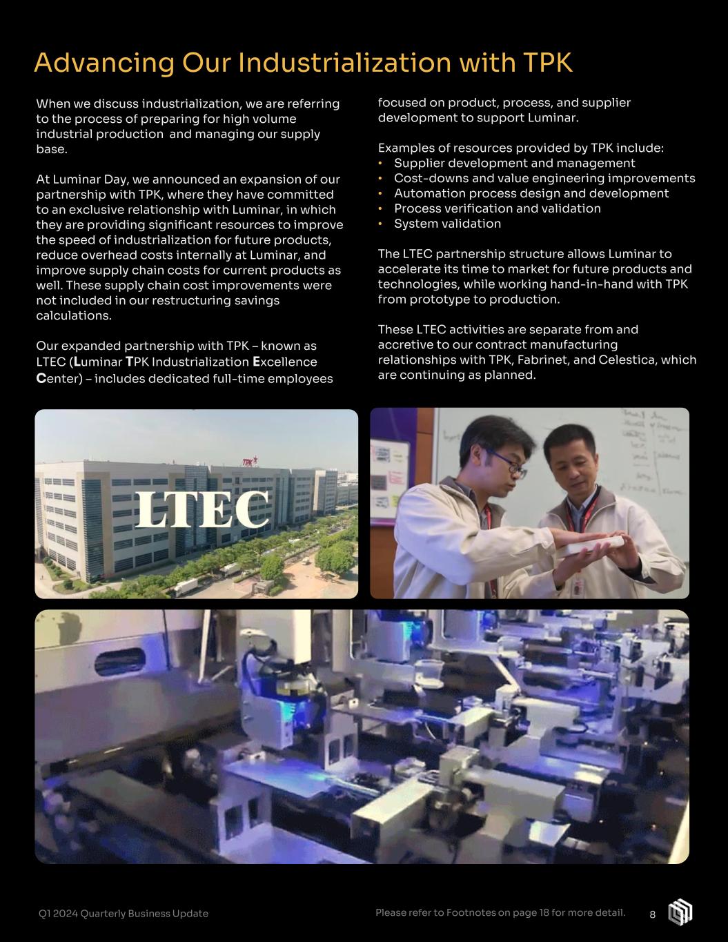 Advancing Our Industrialization with TPK focused on product, process, and supplier development to support Luminar. Examples of resources provided by TPK include: • Supplier development and management • Cost-downs and value engineering improvements • Automation process design and development • Process verification and validation • System validation The LTEC partnership structure allows Luminar to accelerate its time to market for future products and technologies, while working hand-in-hand with TPK from prototype to production. These LTEC activities are separate from and accretive to our contract manufacturing relationships with TPK, Fabrinet, and Celestica, which are continuing as planned. When we discuss industrialization, we are referring to the process of preparing for high volume industrial production and managing our supply base. At Luminar Day, we announced an expansion of our partnership with TPK, where they have committed to an exclusive relationship with Luminar, in which they are providing significant resources to improve the speed of industrialization for future products, reduce overhead costs internally at Luminar, and improve supply chain costs for current products as well. These supply chain cost improvements were not included in our restructuring savings calculations. Our expanded partnership with TPK – known as LTEC (Luminar TPK Industrialization Excellence Center) – includes dedicated full-time employees 8Please refer to Footnotes on page 18 for more detail. Q1 2024 Quarterly Business Update