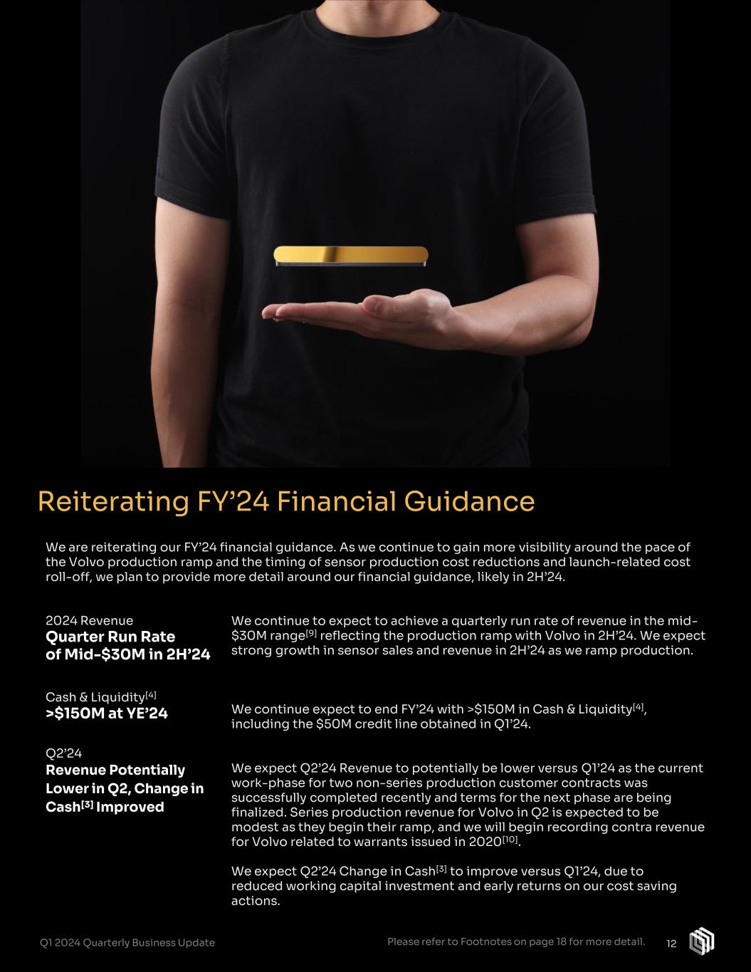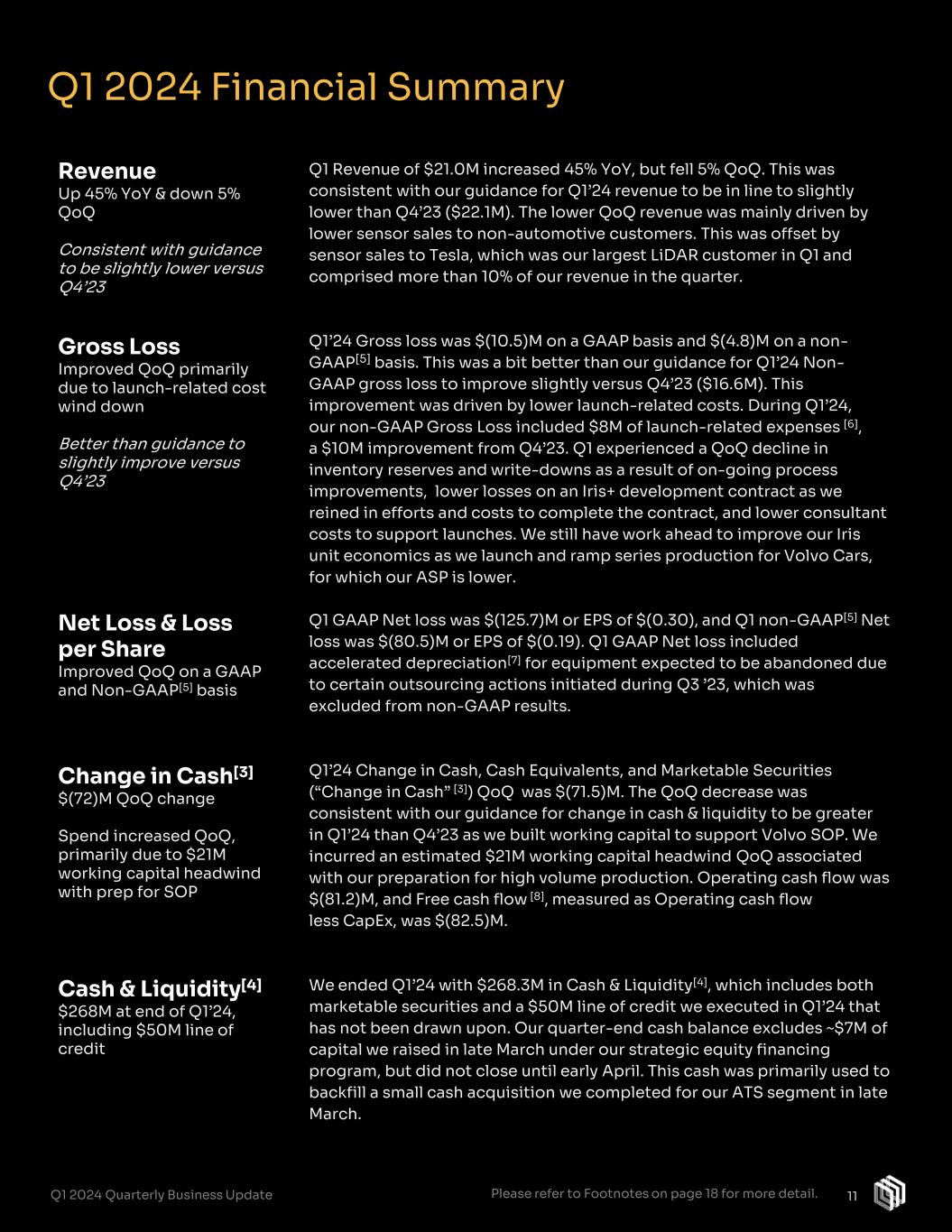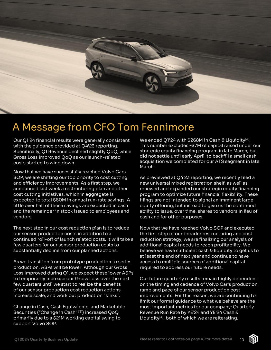 We ended Q1’24 with $268M in Cash & Liquidity[4]. This number excludes ~$7M of capital raised under our strategic equity financing program in late March, but did not settle until early April, to backfill a small cash acquisition we completed for our ATS segment in late March. As previewed at Q4’23 reporting, we recently filed a new universal mixed registration shelf, as well as renewed and expanded our strategic equity financing program to optimize future financial flexibility. These filings are not intended to signal an imminent large equity offering, but instead to give us the continued ability to issue, over time, shares to vendors in lieu of cash and for other purposes. Now that we have reached Volvo SOP and executed the first step of our broader restructuring and cost reduction strategy, we are finalizing our analysis of additional capital needs to reach profitability. We believe we have sufficient cash & liquidity to get us to at least the end of next year and continue to have access to multiple sources of additional capital required to address our future needs. Our future quarterly results remain highly dependent on the timing and cadence of Volvo Car’s production ramp and pace of our sensor production cost improvements. For this reason, we are continuing to limit our formal guidance to what we believe are the most important metrics for our company: Quarterly Revenue Run Rate by YE’24 and YE’24 Cash & Liquidity[4], both of which we are reiterating. Our Q1’24 financial results were generally consistent with the guidance provided at Q4’23 reporting. Specifically, Q1 Revenue declined slightly QoQ, while Gross Loss improved QoQ as our launch-related costs started to wind down. Now that we have successfully reached Volvo Cars SOP, we are shifting our top priority to cost cutting and efficiency improvements. As a first step, we announced last week a restructuring plan and other cost cutting initiatives, which in aggregate is expected to total $80M in annual run-rate savings. A little over half of these savings are expected in cash and the remainder in stock issued to employees and vendors. The next step in our cost reduction plan is to reduce our sensor production costs in addition to a continued roll-off of launch related costs. It will take a few quarters for our sensor production costs to substantially decline from our planned actions. As we transition from prototype production to series production, ASPs will be lower. Although our Gross Loss improved during Q1, we expect these lower ASPs to temporarily increase our Gross Loss over the next few quarters until we start to realize the benefits of our sensor production cost reduction actions, increase scale, and work out production “kinks”. Change in Cash, Cash Equivalents, and Marketable Securities (“Change in Cash” [3]) increased QoQ primarily due to a $21M working capital swing to support Volvo SOP. A Message from CFO Tom Fennimore 10Please refer to Footnotes on page 18 for more detail. Q1 2024 Quarterly Business Update