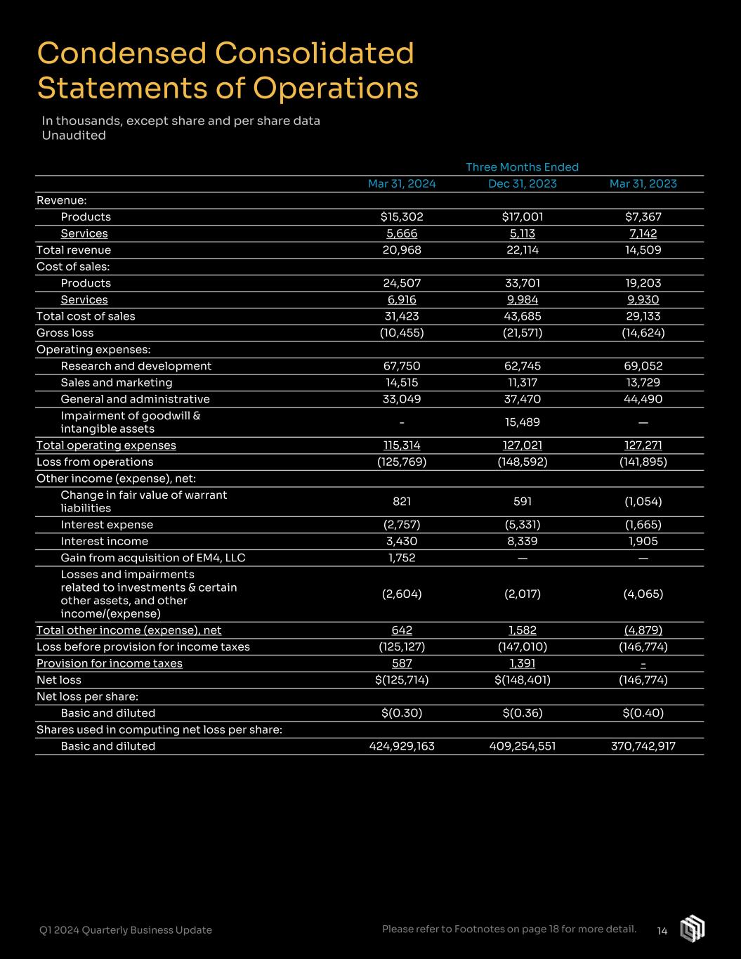 Three Months Ended Mar 31, 2024 Dec 31, 2023 Mar 31, 2023 Revenue: Products $15,302 $17,001 $7,367 Services 5,666 5,113 7,142 Total revenue 20,968 22,114 14,509 Cost of sales: Products 24,507 33,701 19,203 Services 6,916 9,984 9,930 Total cost of sales 31,423 43,685 29,133 Gross loss (10,455) (21,571) (14,624) Operating expenses: Research and development 67,750 62,745 69,052 Sales and marketing 14,515 11,317 13,729 General and administrative 33,049 37,470 44,490 Impairment of goodwill & intangible assets - 15,489 — Total operating expenses 115,314 127,021 127,271 Loss from operations (125,769) (148,592) (141,895) Other income (expense), net: Change in fair value of warrant liabilities 821 591 (1,054) Interest expense (2,757) (5,331) (1,665) Interest income 3,430 8,339 1,905 Gain from acquisition of EM4, LLC 1,752 — — Losses and impairments related to investments & certain other assets, and other income/(expense) (2,604) (2,017) (4,065) Total other income (expense), net 642 1,582 (4,879) Loss before provision for income taxes (125,127) (147,010) (146,774) Provision for income taxes 587 1,391 - Net loss $(125,714) $(148,401) (146,774) Net loss per share: Basic and diluted $(0.30) $(0.36) $(0.40) Shares used in computing net loss per share: Basic and diluted 424,929,163 409,254,551 370,742,917 Condensed Consolidated Statements of Operations In thousands, except share and per share data Unaudited 14Please refer to Footnotes on page 18 for more detail. Q1 2024 Quarterly Business Update