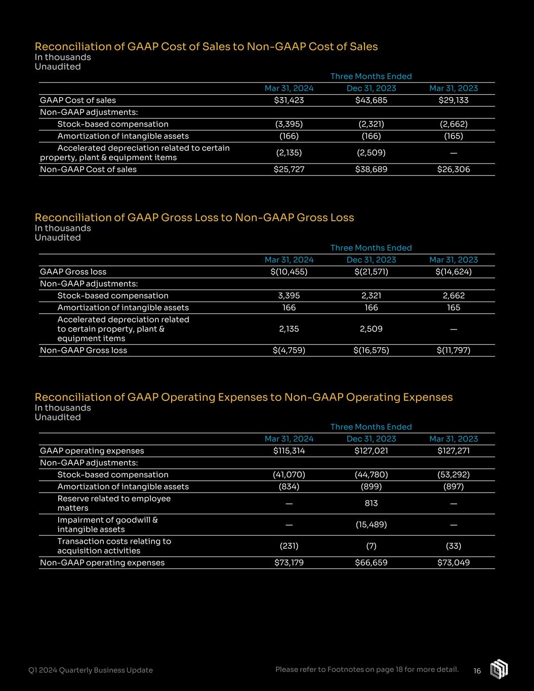 Three Months Ended Mar 31, 2024 Dec 31, 2023 Mar 31, 2023 GAAP Gross loss $(10,455) $(21,571) $(14,624) Non-GAAP adjustments: Stock-based compensation 3,395 2,321 2,662 Amortization of intangible assets 166 166 165 Accelerated depreciation related to certain property, plant & equipment items 2,135 2,509 — Non-GAAP Gross loss $(4,759) $(16,575) $(11,797) Reconciliation of GAAP Cost of Sales to Non-GAAP Cost of Sales In thousands Unaudited Reconciliation of GAAP Gross Loss to Non-GAAP Gross Loss In thousands Unaudited Three Months Ended Mar 31, 2024 Dec 31, 2023 Mar 31, 2023 GAAP operating expenses $115,314 $127,021 $127,271 Non-GAAP adjustments: Stock-based compensation (41,070) (44,780) (53,292) Amortization of intangible assets (834) (899) (897) Reserve related to employee matters — 813 — Impairment of goodwill & intangible assets — (15,489) — Transaction costs relating to acquisition activities (231) (7) (33) Non-GAAP operating expenses $73,179 $66,659 $73,049 Reconciliation of GAAP Operating Expenses to Non-GAAP Operating Expenses In thousands Unaudited Three Months Ended Mar 31, 2024 Dec 31, 2023 Mar 31, 2023 GAAP Cost of sales $31,423 $43,685 $29,133 Non-GAAP adjustments: Stock-based compensation (3,395) (2,321) (2,662) Amortization of intangible assets (166) (166) (165) Accelerated depreciation related to certain property, plant & equipment items (2,135) (2,509) — Non-GAAP Cost of sales $25,727 $38,689 $26,306 16Please refer to Footnotes on page 18 for more detail. Q1 2024 Quarterly Business Update