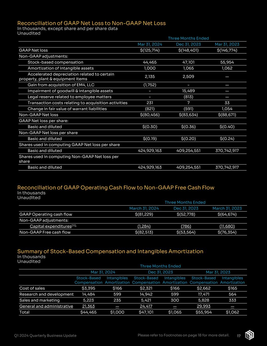 Three Months Ended Mar 31, 2024 Dec 31, 2023 Mar 31, 2023 GAAP Net loss $(125,714) $(148,401) $(146,774) Non-GAAP adjustments: Stock-based compensation 44,465 47,101 55,954 Amortization of intangible assets 1,000 1,065 1,062 Accelerated depreciation related to certain property, plant & equipment items 2,135 2,509 — Gain from acquisition of EM4, LLC (1,752) - — Impairment of goodwill & intangible assets - 15,489 — Legal reserve related to employee matters - (813) — Transaction costs relating to acquisition activities 231 7 33 Change in fair value of warrant liabilities (821) (591) 1,054 Non-GAAP Net loss $(80,456) $(83,634) $(88,671) GAAP Net loss per share: Basic and diluted $(0.30) $(0.36) $(0.40) Non-GAAP Net loss per share Basic and diluted $(0.19) $(0.20) $(0.24) Shares used in computing GAAP Net loss per share Basic and diluted 424,929,163 409,254,551 370,742,917 Shares used in computing Non-GAAP Net loss per share Basic and diluted 424,929,163 409,254,551 370,742,917 Reconciliation of GAAP Net Loss to Non-GAAP Net Loss In thousands, except share and per share data Unaudited 17 Reconciliation of GAAP Operating Cash Flow to Non-GAAP Free Cash Flow In thousands Unaudited Summary of Stock-Based Compensation and Intangibles Amortization In thousands Unaudited Three Months Ended March 31, 2024 Dec 31, 2023 March 31, 2023 GAAP Operating cash flow $(81,229) $(52,778) $(64,674) Non-GAAP adjustments: Capital expenditures[11]: (1,284) (786) (11,680) Non-GAAP Free cash flow $(82,513) $(53,564) $(76,354) Three Months Ended Mar 31, 2024 Dec 31, 2023 Mar 31, 2023 Stock-Based Compensation Intangibles Amortization Stock-Based Compensation Intangibles Amortization Stock-Based Compensation Intangibles Amortization Cost of sales $3,395 $166 $2,321 $166 $2,662 $165 Research and development 14,484 599 14,942 599 17,471 564 Sales and marketing 5,223 235 5,421 300 5,828 333 General and administrative 21,363 — 24,417 — 29,993 — Total $44,465 $1,000 $47,101 $1,065 $55,954 $1,062 Please refer to Footnotes on page 18 for more detail. Q1 2024 Quarterly Business Update