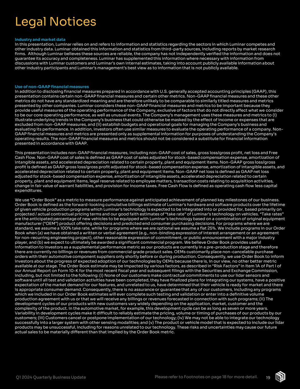 Legal Notices Industry and market data In this presentation, Luminar relies on and refers to information and statistics regarding the sectors in which Luminar competes and other industry data. Luminar obtained this information and statistics from third-party sources, including reports by market research firms. Although Luminar believes these sources are reliable, the company has not independently verified the information and does not guarantee its accuracy and completeness. Luminar has supplemented this information where necessary with information from discussions with Luminar customers and Luminar’s own internal estimates, taking into account publicly available information about other industry participants and Luminar’s management’s best view as to information that is not publicly available. Use of non-GAAP financial measures In addition to disclosing financial measures prepared in accordance with U.S. generally accepted accounting principles (GAAP), this presentation contains certain non-GAAP financial measures and certain other metrics. Non-GAAP financial measures and these other metrics do not have any standardized meaning and are therefore unlikely to be comparable to similarly titled measures and metrics presented by other companies. Luminar considers these non-GAAP financial measures and metrics to be important because they provide useful measures of the operating performance of the Company, exclusive of factors that do not directly affect what we consider to be our core operating performance, as well as unusual events. The Company’s management uses these measures and metrics to (i) illustrate underlying trends in the Company’s business that could otherwise be masked by the effect of income or expenses that are excluded from non-GAAP measures, and (ii) establish budgets and operational goals for managing the Company’s business and evaluating its performance. In addition, investors often use similar measures to evaluate the operating performance of a company. Non- GAAP financial measures and metrics are presented only as supplemental information for purposes of understanding the Company’s operating results. The non-GAAP financial measures and metrics should not be considered a substitute for financial information presented in accordance with GAAP. This presentation includes non-GAAP financial measures, including non-GAAP cost of sales, gross loss/gross profit, net loss and Free Cash Flow. Non-GAAP cost of sales is defined as GAAP cost of sales adjusted for stock-based compensation expense, amortization of intangible assets, and accelerated depreciation related to certain property, plant and equipment items. Non-GAAP gross loss/gross profit is defined as GAAP gross loss/gross profit adjusted for stock-based compensation expense, amortization of intangible assets, and accelerated depreciation related to certain property, plant and equipment items. Non-GAAP net loss is defined as GAAP net loss adjusted for stock-based compensation expense, amortization of intangible assets, accelerated depreciation related to certain property, plant and equipment items, legal reserve related to employee matters, transaction costs relating to acquisition activities, change in fair value of warrant liabilities, and provision for income taxes. Free Cash Flow is defined as operating cash flow less capital expenditures. We use “Order Book” as a metric to measure performance against anticipated achievement of planned key milestones of our business. Order Book is defined as the forward-looking cumulative billings estimate of Luminar’s hardware and software products over the lifetime of given vehicle production programs which Luminar’s technology is expected to be integrated into or provided for, based primarily on projected / actual contractual pricing terms and our good faith estimates of “take rate” of Luminar’s technology on vehicles. “Take rates” are the anticipated percentage of new vehicles to be equipped with Luminar’s technology based on a combination of original equipment manufacturer (“OEM”) product offering decisions and predicted end consumer purchasing decisions. For programs where we are standard, we assume a 100% take rate, while for programs where we are optional we assume a flat 25%. We include programs in our Order Book when (a) we have obtained a written or verbal agreement (e.g., non-binding expression of interest arrangement or an agreement for non-recurring engineering project), other reasonable expression of commitment, or public announcement with a major industry player, and (b) we expect to ultimately be awarded a significant commercial program. We believe Order Book provides useful information to investors as a supplemental performance metric as our products are currently in a pre-production stage and therefore there are currently no billings or revenues from commercial grade product sales. OEMs customarily place non-cancelable purchase orders with their automotive component suppliers only shortly before or during production. Consequently, we use Order Book to inform investors about the progress of expected adoption of our technologies by OEMs because there is, in our view, no other better metric available at our stage. The Order Book estimate may be impacted by various factors, as described in “Risk Factors” in Item 1A of Part I of our Annual Report on Form 10-K for the most recent fiscal year and subsequent filings with the Securities and Exchange Commission, including, but not limited to the following: (i) None of our customers make contractual commitments to use our lidar sensors and software until all test and validation activities have been completed, they have finalized plans for integrating our systems, have a positive expectation of the market demand for our features, and unrelated to us, have determined that their vehicle is ready for market and there is appropriate consumer demand. Consequently, there is no assurance or guarantee 
