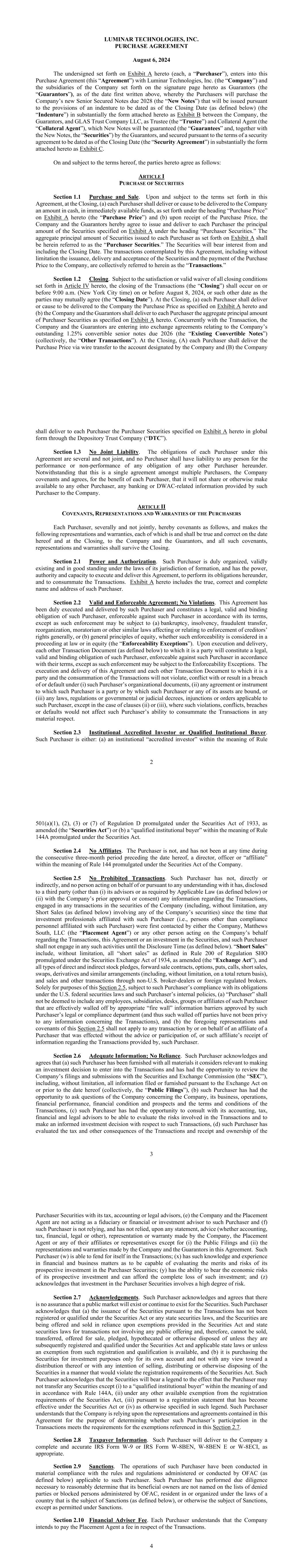 LUMINAR TECHNOLOGIES, INC. PURCHASE AGREEMENT August 6, 2024 The undersigned set forth on Exhibit A hereto (each, a “Purchaser”), enters into this Purchase Agreement (this “Agreement”) with Luminar Technologies, Inc. (the “Company”) and the subsidiaries of the Company set forth on the signature page hereto as Guarantors (the “Guarantors”), as of the date first written above, whereby the Purchasers will purchase the Company’s new Senior Secured Notes due 2028 (the “New Notes”) that will be issued pursuant to the provisions of an indenture to be dated as of the Closing Date (as defined below) (the “Indenture”) in substantially the form attached hereto as Exhibit B between the Company, the Guarantors, and GLAS Trust Company LLC, as Trustee (the “Trustee”) and Collateral Agent (the “Collateral Agent”), which New Notes will be guaranteed (the “Guarantees” and, together with the New Notes, the “Securities”) by the Guarantors, and secured pursuant to the terms of a security agreement to be dated as of the Closing Date (the “Security Agreement”) in substantially the form attached hereto as Exhibit C. On and subject to the terms hereof, the parties hereto agree as follows: ARTICLE I PURCHASE OF SECURITIES Section 1.1 Purchase and Sale. Upon and subject to the terms set forth in this Agreement, at the Closing, (a) each Purchaser shall deliver or cause to be delivered to the Company an amount in cash, in immediately available funds, as set forth under the heading “Purchase Price” on Exhibit A hereto (the “Purchase Price”) and (b) upon receipt of the Purchase Price, the Company and the Guarantors hereby agree to issue and deliver to each Purchaser the principal amount of the Securities specified on Exhibit A under the heading “Purchaser Securities.” The aggregate principal amount of Securities issued to each Purchaser as set forth on Exhibit A shall be herein referred to as the “Purchaser Securities.” The Securities will bear interest from and including the Closing Date. The transactions contemplated by this Agreement, including without limitation the issuance, delivery and acceptance of the Securities and the payment of the Purchase Price to the Company, are collectively referred to herein as the “Transactions.” Section 1.2 Closing. Subject to the satisfaction or valid waiver of all closing conditions set forth in Article IV hereto, the closing of the Transactions (the “Closing”) shall occur on or before 9:00 a.m. (New York City time) on or before August 8, 2024, or such other date as the parties may mutually agree (the “Closing Date”). At the Closing, (a) each Purchaser shall deliver or cause to be delivered to the Company the Purchase Price as specified on Exhibit A hereto and (b) the Company and the Guarantors shall deliver to each Purchaser the aggregate principal amount of Purchaser Securities as specified on Exhibit A hereto. Concurrently with the Transaction, the Company and the Guarantors are entering into exchange agreements relating to the Company’s outstanding 1.25% convertible senior notes due 2026 (the “Existing Convertible Notes”) (collectively, the “Other Transactions”). At the Closing, (A) each Purchaser shall deliver the Purchase Price via wire transfer to the account designated by the Company and (B) the Company 2 shall deliver to each Purchaser the Purchaser Securities specified on Exhibit A hereto in global form through the Depository Trust Company (“DTC”). Section 1.3 No Joint Liability. The obligations of each Purchaser under this Agreement are several and not joint, and no Purchaser shall have liability to any person for the performance or non-performance of any obligation of any other Purchaser hereunder. Notwithstanding that this is a single agreement amongst multiple Purchasers, the Company covenants and agrees, for the benefit of each Purchaser, that it will not share or otherwise make available to any other Purchaser, any banking or DWAC-related information provided by such Purchaser to the Company. ARTICLE II COVENANTS, REPRESENTATIONS AND WARRANTIES OF THE PURCHASERS Each Purchaser, severally and not jointly, hereby covenants as follows, and makes the following representations and warranties, each of which is and shall be true and correct on the date hereof and at the Closing, to the Company and the Guarantors, and all such covenants, representations and warranties shall survive the Closing. Section 2.1 Power and Authorization. Such Purchaser is duly organized, validly existing and in good standing under the laws of its jurisdiction of formation, and has the power, authority and capacity to execute and deliver this Agreement, to perform its obligations hereunder, and to consummate the Transactions. Exhibit A hereto includes the true, correct and complete name and address of such Purchaser. Section 2.2 Valid and Enforceable Agreement; No Violations. This Agreement has been duly executed and delivered by such Purchaser and constitutes a legal, valid and binding obligation of such Purchaser, enforceable against such Purchaser in accordance with its terms, except as such enforcement may be subject to (a) bankruptcy, insolvency, fraudulent transfer, reorganization, moratorium or other similar laws affecting or relating to enforcement of creditors’ rights generally, or (b) general principles of equity, whether such enforceability is considered in a proceeding at law or in equity (the “Enforceability Exceptions”). Upon execution and delivery, each other Transaction Document (as defined below) to which it is a party will constitute a legal, valid and binding obligation of such Purchaser, enforceable against such Purchaser in accordance with their terms, except as such enforcement may be subject to the Enforceability Exceptions. The execution and delivery of this Agreement and each other Transaction Document to which it is a party and the consummation of the Transactions will not viola