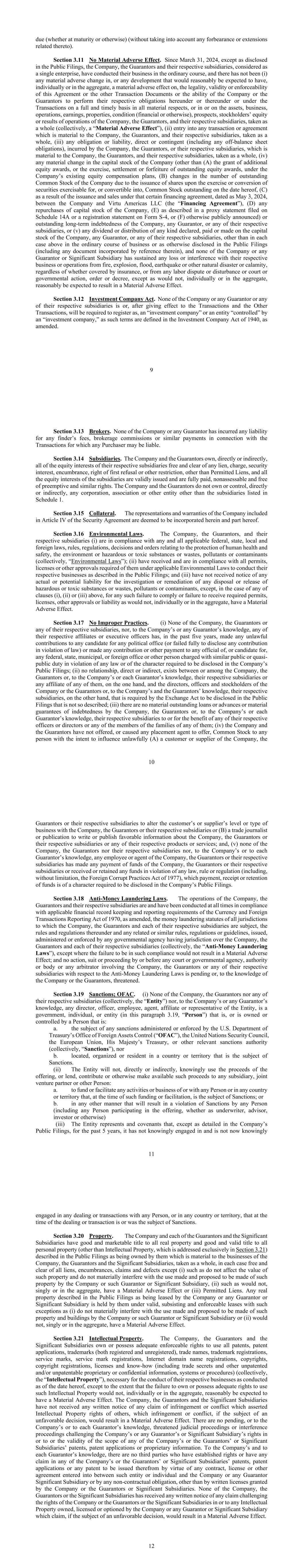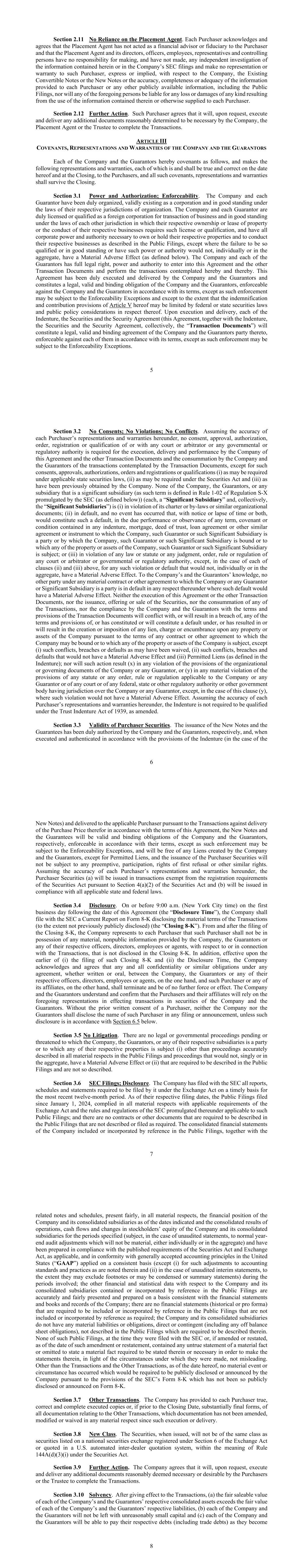 9 due (whether at maturity or otherwise) (without taking into account any forbearance or extensions related thereto). Section 3.11 No Material Adverse Effect. Since March 31, 2024, except as disclosed in the Public Filings, the Company, the Guarantors and their respective subsidiaries, considered as a single enterprise, have conducted their business in the ordinary course, and there has not been (i) any material adverse change in, or any development that would reasonably be expected to have, individually or in the aggregate, a material adverse effect on, the legality, validity or enforceability of this Agreement or the other Transaction Documents or the ability of the Company or the Guarantors to perform their respective obligations hereunder or thereunder or under the Transactions on a full and timely basis in all material respects, or in or on the assets, business, operations, earnings, properties, condition (financial or otherwise), prospects, stockholders’ equity or results of operations of the Company, the Guarantors, and their respective subsidiaries, taken as a whole (collectively, a “Material Adverse Effect”), (ii) entry into any transaction or agreement which is material to the Company, the Guarantors, and their respective subsidiaries, taken as a whole, (iii) any obligation or liability, direct or contingent (including any off-balance sheet obligations), incurred by the Company, the Guarantors, or their respective subsidiaries, which is material to the Company, the Guarantors, and their respective subsidiaries, taken as a whole, (iv) any material change in the capital stock of the Company (other than (A) the grant of additional equity awards, or the exercise, settlement or forfeiture of outstanding equity awards, under the Company’s existing equity compensation plans, (B) changes in the number of outstanding Common Stock of the Company due to the issuance of shares upon the exercise or conversion of securities exercisable for, or convertible into, Common Stock outstanding on the date hereof, (C) as a result of the issuance and sales under that certain financing agreement, dated as May 3, 2024, between the Company and Virtu Americas LLC (the “Financing Agreement”), (D) any repurchases of capital stock of the Company, (E) as described in a proxy statement filed on Schedule 14A or a registration statement on Form S-4, or (F) otherwise publicly announced) or outstanding long-term indebtedness of the Company, any Guarantor, or any of their respective subsidiaries, or (v) any dividend or distribution of any kind declared, paid or made on the capital stock of the Company, any Guarantor, or any of their respective subsidiaries, other than in each case above in the ordinary course of business or as otherwise disclosed in the Public Filings (including any document incorporated by reference therein), and none of the Company or any Guarantor or Significant Subsidiary has sustained any loss or interference with their respective business or operations from fire, explosion, flood, earthquake or other natural disaster or calamity, regardless of whether covered by insurance, or from any labor dispute or disturbance or court or governmental action, order or decree, except as would not, individually or in the aggregate, reasonably be expected to result in a Material Adverse Effect. Section 3.12 Investment Company Act. None of the Company or any Guarantor or any of their respective subsidiaries is or, after giving effect to the Transactions and the Other Transactions, will be required to register as, an “investment company” or an entity “controlled” by an “investment company,” as such terms are defined in the Investment Company Act of 1940, as amended. 10 Section 3.13 Brokers. None of the Company or any Guarantor has incurred any liability for any finder’s fees, brokerage commissions or similar payments in connection with the Transactions for which any Purchaser may be liable. Section 3.14 Subsidiaries. The Company and the Guarantors own, directly or indirectly, all of the equity interests of their respective subsidiaries free and clear of any lien, charge, security interest, encumbrance, right of first refusal or other restriction, other than Permitted Liens, and all the equity interests of the subsidiaries are validly issued and are fully paid, nonassessable and free of preemptive and similar rights. The Company and the Guarantors do not own or control, directly or indirectly, any corporation, association or other entity other than the subsidiaries listed in Schedule 1. Section 3.15 Collateral. The representations and warranties of the Company included in Article IV of the Security Agreement are deemed to be incorporated herein and part hereof. Section 3.16 Environmental Laws. The Company, the Guarantors, and their respective subsidiaries (i) are in compliance with any and all applicable federal, state, local and foreign laws, rules, regulations, decisions and orders relating to the protection of human health and safety, the environment or hazardous or toxic substances or wastes, pollutants or contaminants (collectively, “Environmental Laws”); (ii) have received and are in compliance with all permits, licenses or other approvals required of them under applicable Environmental Laws to conduct their respective businesses as described in the Public Filings; and (iii) have not received notice of any actual or potential liability for the investigation or remediation of any disposal or release of hazardous or toxic substances or wastes, pollutants or contaminants, except, in the case of any of clauses (i), (ii) or (iii) above, for any such failure to comply or failure to receive required permits, licenses, other approvals or liability as would not, individually or in the aggregate, have a Material Adverse Effect. Section 3.17 No Improper Practices. (i) None of the Company, the Guarantors or any of their respective subsidiaries, nor, to the Company’s or any Guarantor’s