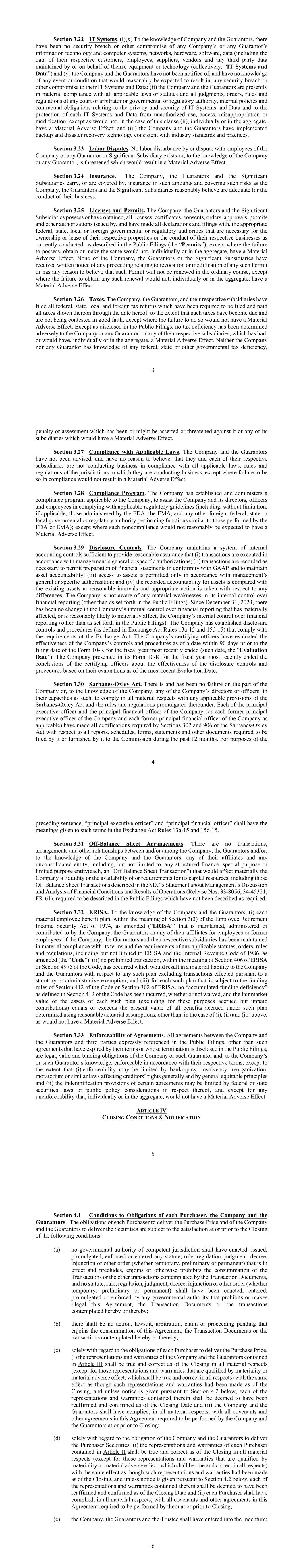 13 Section 3.22 IT Systems. (i)(x) To the knowledge of Company and the Guarantors, there have been no security breach or other compromise of any Company’s or any Guarantor’s information technology and computer systems, networks, hardware, software, data (including the data of their respective customers, employees, suppliers, vendors and any third party data maintained by or on behalf of them), equipment or technology (collectively, “IT Systems and Data”) and (y) the Company and the Guarantors have not been notified of, and have no knowledge of any event or condition that would reasonably be expected to result in, any security breach or other compromise to their IT Systems and Data; (ii) the Company and the Guarantors are presently in material compliance with all applicable laws or statutes and all judgments, orders, rules and regulations of any court or arbitrator or governmental or regulatory authority, internal policies and contractual obligations relating to the privacy and security of IT Systems and Data and to the protection of such IT Systems and Data from unauthorized use, access, misappropriation or modification, except as would not, in the case of this clause (ii), individually or in the aggregate, have a Material Adverse Effect; and (iii) the Company and the Guarantors have implemented backup and disaster recovery technology consistent with industry standards and practices. Section 3.23 Labor Disputes. No labor disturbance by or dispute with employees of the Company or any Guarantor or Significant Subsidiary exists or, to the knowledge of the Company or any Guarantor, is threatened which would result in a Material Adverse Effect. Section 3.24 Insurance. The Company, the Guarantors and the Significant Subsidiaries carry, or are covered by, insurance in such amounts and covering such risks as the Company, the Guarantors and the Significant Subsidiaries reasonably believe are adequate for the conduct of their business. Section 3.25 Licenses and Permits. The Company, the Guarantors and the Significant Subsidiaries possess or have obtained, all licenses, certificates, consents, orders, approvals, permits and other authorizations issued by, and have made all declarations and filings with, the appropriate federal, state, local or foreign governmental or regulatory authorities that are necessary for the ownership or lease of their respective properties or the conduct of their respective businesses as currently conducted, as described in the Public Filings (the “Permits”), except where the failure to possess, obtain or make the same would not, individually or in the aggregate, have a Material Adverse Effect. None of the Company, the Guarantors or the Significant Subsidiaries have received written notice of any proceeding relating to revocation or modification of any such Permit or has any reason to believe that such Permit will not be renewed in the ordinary course, except where the failure to obtain any such renewal would not, individually or in the aggregate, have a Material Adverse Effect. Section 3.26 Taxes. The Company, the Guarantors, and their respective subsidiaries have filed all federal, state, local and foreign tax returns which have been required to be filed and paid all taxes shown thereon through the date hereof, to the extent that such taxes have become due and are not being contested in good faith, except where the failure to do so would not have a Material Adverse Effect. Except as disclosed in the Public Filings, no tax deficiency has been determined adversely to the Company or any Guarantor, or any of their respective subsidiaries, which has had, or would have, individually or in the aggregate, a Material Adverse Effect. Neither the Company nor any Guarantor has knowledge of any federal, state or other governmental tax deficiency, 14 penalty or assessment which has been or might be asserted or threatened against it or any of its subsidiaries which would have a Material Adverse Effect. Section 3.27 Compliance with Applicable Laws. The Company and the Guarantors have not been advised, and have no reason to believe, that they and each of their respective subsidiaries are not conducting business in compliance with all applicable laws, rules and regulations of the jurisdictions in which they are conducting business, except where failure to be so in compliance would not result in a Material Adverse Effect. Section 3.28 Compliance Program. The Company has established and administers a compliance program applicable to the Company, to assist the Company and its directors, officers and employees in complying with applicable regulatory guidelines (including, without limitation, if applicable, those administered by the FDA, the EMA, and any other foreign, federal, state or local governmental or regulatory authority performing functions similar to those performed by the FDA or EMA); except where such noncompliance would not reasonably be expected to have a Material Adverse Effect. Section 3.29 Disclosure Controls. The Company maintains a system of internal accounting controls sufficient to provide reasonable assurance that (i) transactions are executed in accordance with management’s general or specific authorizations; (ii) transactions are recorded as necessary to permit preparation of financial statements in conformity with GAAP and to maintain asset accountability; (iii) access to assets is permitted only in accordance with management’s general or specific authorization; and (iv) the recorded accountability for assets is compared with the existing assets at reasonable intervals and appropriate action is taken with respect to any differences. The Company is not aware of any material weaknesses in its internal control over financial reporting (other than as set forth in the Public Filings). Since December 31, 2023, there has been no change in the Company’s internal control over financial reporting that has materially affected, or is reasonably likely to material
