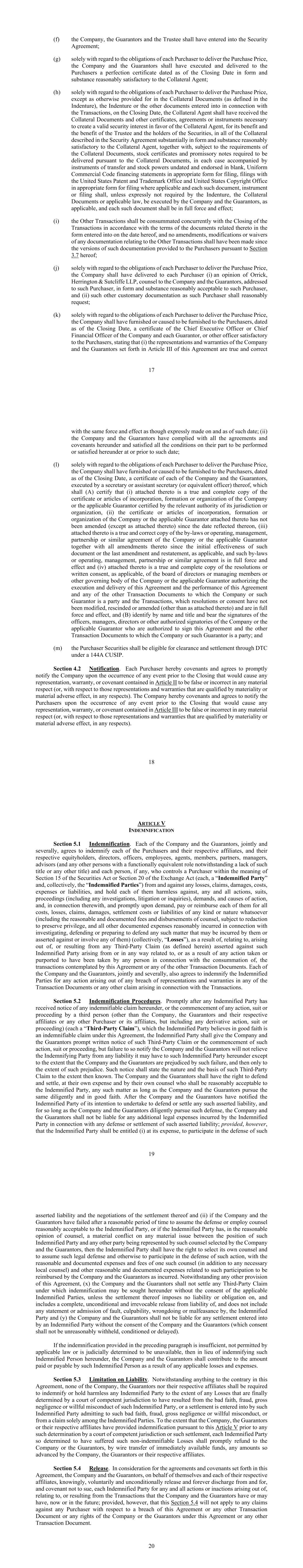 17 (f) the Company, the Guarantors and the Trustee shall have entered into the Security Agreement; (g) solely with regard to the obligations of each Purchaser to deliver the Purchase Price, the Company and the Guarantors shall have executed and delivered to the Purchasers a perfection certificate dated as of the Closing Date in form and substance reasonably satisfactory to the Collateral Agent; (h) solely with regard to the obligations of each Purchaser to deliver the Purchase Price, except as otherwise provided for in the Collateral Documents (as defined in the Indenture), the Indenture or the other documents entered into in connection with the Transactions, on the Closing Date, the Collateral Agent shall have received the Collateral Documents and other certificates, agreements or instruments necessary to create a valid security interest in favor of the Collateral Agent, for its benefit and the benefit of the Trustee and the holders of the Securities, in all of the Collateral described in the Security Agreement substantially in form and substance reasonably satisfactory to the Collateral Agent, together with, subject to the requirements of the Collateral Documents, stock certificates and promissory notes required to be delivered pursuant to the Collateral Documents, in each case accompanied by instruments of transfer and stock powers undated and endorsed in blank, Uniform Commercial Code financing statements in appropriate form for filing, filings with the United States Patent and Trademark Office and United States Copyright Office in appropriate form for filing where applicable and each such document, instrument or filing shall, unless expressly not required by the Indenture, the Collateral Documents or applicable law, be executed by the Company and the Guarantors, as applicable, and each such document shall be in full force and effect; (i) the Other Transactions shall be consummated concurrently with the Closing of the Transactions in accordance with the terms of the documents related thereto in the form entered into on the date hereof, and no amendments, modifications or waivers of any documentation relating to the Other Transactions shall have been made since the versions of such documentation provided to the Purchasers pursuant to Section 3.7 hereof; (j) solely with regard to the obligations of each Purchaser to deliver the Purchase Price, the Company shall have delivered to each Purchaser (i) an opinion of Orrick, Herrington & Sutcliffe LLP, counsel to the Company and the Guarantors, addressed to such Purchaser, in form and substance reasonably acceptable to such Purchaser, and (ii) such other customary documentation as such Purchaser shall reasonably request; (k) solely with regard to the obligations of each Purchaser to deliver the Purchase Price, the Company shall have furnished or caused to be furnished to the Purchasers, dated as of the Closing Date, a certificate of the Chief Executive Officer or Chief Financial Officer of the Company and each Guarantor, or other officer satisfactory to the Purchasers, stating that (i) the representations and warranties of the Company and the Guarantors set forth in Article III of this Agreement are true and correct 18 with the same force and effect as though expressly made on and as of such date; (ii) the Company and the Guarantors have complied with all the agreements and covenants hereunder and satisfied all the conditions on their part to be performed or satisfied hereunder at or prior to such date; (l) solely with regard to the obligations of each Purchaser to deliver the Purchase Price, the Company shall have furnished or caused to be furnished to the Purchasers, dated as of the Closing Date, a certificate of each of the Company and the Guarantors, executed by a secretary or assistant secretary (or equivalent officer) thereof, which shall (A) certify that (i) attached thereto is a true and complete copy of the certificate or articles of incorporation, formation or organization of the Company or the applicable Guarantor certified by the relevant authority of its jurisdiction or organization, (ii) the certificate or articles of incorporation, formation or organization of the Company or the applicable Guarantor attached thereto has not been amended (except as attached thereto) since the date reflected thereon, (iii) attached thereto is a true and correct copy of the by-laws or operating, management, partnership or similar agreement of the Company or the applicable Guarantor together with all amendments thereto since the initial effectiveness of such document or the last amendment and restatement, as applicable, and such by-laws or operating, management, partnership or similar agreement is in full force and effect and (iv) attached thereto is a true and complete copy of the resolutions or written consent, as applicable, of the board of directors or managing members or other governing body of the Company or the applicable Guarantor authorizing the execution and delivery of this Agreement and the performance of this Agreement and any of the other Transaction Documents to which the Company or such Guarantor is a party and the Transactions, which resolutions or consent have not been modified, rescinded or amended (other than as attached thereto) and are in full force and effect, and (B) identify by name and title and bear the signatures of the officers, managers, directors or other authorized signatories of the Company or the applicable Guarantor who are authorized to sign this Agreement and the other Transaction Documents to which the Company or such Guarantor is a party; and (m) the Purchaser Securities shall be eligible for clearance and settlement through DTC under a 144A CUSIP. Section 4.2 Notification. Each Purchaser hereby covenants and agrees to promptly notify the Company upon the occurrence of any event prior to the Closing that would cause any representation, warranty, or covenant contained in Article II to be false or incorrect in 