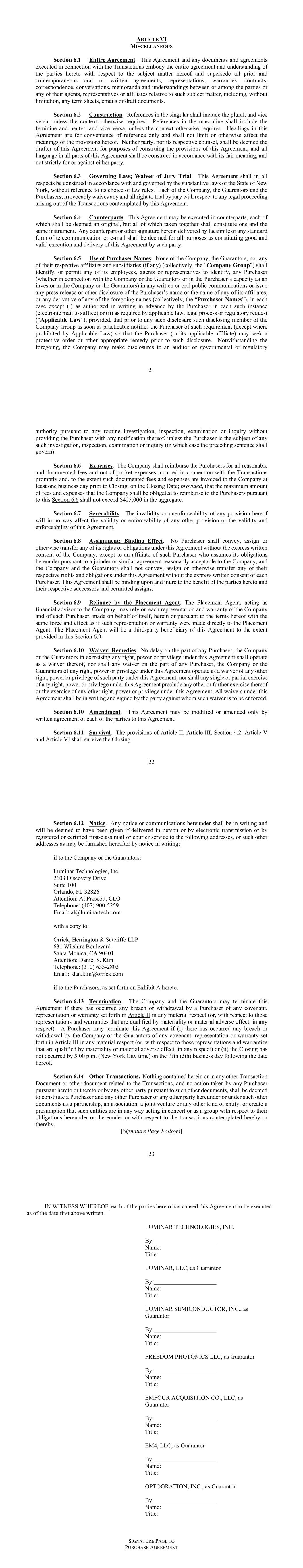 21 ARTICLE VI MISCELLANEOUS Section 6.1 Entire Agreement. This Agreement and any documents and agreements executed in connection with the Transactions embody the entire agreement and understanding of the parties hereto with respect to the subject matter hereof and supersede all prior and contemporaneous oral or written agreements, representations, warranties, contracts, correspondence, conversations, memoranda and understandings between or among the parties or any of their agents, representatives or affiliates relative to such subject matter, including, without limitation, any term sheets, emails or draft documents. Section 6.2 Construction. References in the singular shall include the plural, and vice versa, unless the context otherwise requires. References in the masculine shall include the feminine and neuter, and vice versa, unless the context otherwise requires. Headings in this Agreement are for convenience of reference only and shall not limit or otherwise affect the meanings of the provisions hereof. Neither party, nor its respective counsel, shall be deemed the drafter of this Agreement for purposes of construing the provisions of this Agreement, and all language in all parts of this Agreement shall be construed in accordance with its fair meaning, and not strictly for or against either party. Section 6.3 Governing Law; Waiver of Jury Trial. This Agreement shall in all respects be construed in accordance with and governed by the substantive laws of the State of New York, without reference to its choice of law rules. Each of the Company, the Guarantors and the Purchasers, irrevocably waives any and all right to trial by jury with respect to any legal proceeding arising out of the Transactions contemplated by this Agreement. Section 6.4 Counterparts. This Agreement may be executed in counterparts, each of which shall be deemed an original, but all of which taken together shall constitute one and the same instrument. Any counterpart or other signature hereon delivered by facsimile or any standard form of telecommunication or e-mail shall be deemed for all purposes as constituting good and valid execution and delivery of this Agreement by such party. Section 6.5 Use of Purchaser Names. None of the Company, the Guarantors, nor any of their respective affiliates and subsidiaries (if any) (collectively, the “Company Group”) shall identify, or permit any of its employees, agents or representatives to identify, any Purchaser (whether in connection with the Company or the Guarantors or in the Purchaser’s capacity as an investor in the Company or the Guarantors) in any written or oral public communications or issue any press release or other disclosure of the Purchaser’s name or the name of any of its affiliates, or any derivative of any of the foregoing names (collectively, the “Purchaser Names”), in each case except (i) as authorized in writing in advance by the Purchaser in each such instance (electronic mail to suffice) or (ii) as required by applicable law, legal process or regulatory request (“Applicable Law”); provided, that prior to any such disclosure such disclosing member of the Company Group as soon as practicable notifies the Purchaser of such requirement (except where prohibited by Applicable Law) so that the Purchaser (or its applicable affiliate) may seek a protective order or other appropriate remedy prior to such disclosure. Notwithstanding the foregoing, the Company may make disclosures to an auditor or governmental or regulatory 22 authority pursuant to any routine investigation, inspection, examination or inquiry without providing the Purchaser with any notification thereof, unless the Purchaser is the subject of any such investigation, inspection, examination or inquiry (in which case the preceding sentence shall govern). Section 6.6 Expenses. The Company shall reimburse the Purchasers for all reasonable and documented fees and out-of-pocket expenses incurred in connection with the Transactions promptly and, to the extent such documented fees and expenses are invoiced to the Company at least one business day prior to Closing, on the Closing Date; provided, that the maximum amount of fees and expenses that the Company shall be obligated to reimburse to the Purchasers pursuant to this Section 6.6 shall not exceed $425,000 in the aggregate. Section 6.7 Severability. The invalidity or unenforceability of any provision hereof will in no way affect the validity or enforceability of any other provision or the validity and enforceability of this Agreement. Section 6.8 Assignment; Binding Effect. No Purchaser shall convey, assign or otherwise transfer any of its rights or obligations under this Agreement without the express written consent of the Company, except to an affiliate of such Purchaser who assumes its obligations hereunder pursuant to a joinder or similar agreement reasonably acceptable to the Company, and the Company and the Guarantors shall not convey, assign or otherwise transfer any of their respective rights and obligations under this Agreement without the express written consent of each Purchaser. This Agreement shall be binding upon and inure to the benefit of the parties hereto and their respective successors and permitted assigns. Section 6.9 Reliance by the Placement Agent. The Placement Agent, acting as financial advisor to the Company, may rely on each representation and warranty of the Company and of each Purchaser, made on behalf of itself, herein or pursuant to the terms hereof with the same force and effect as if such representation or warranty were made directly to the Placement Agent. The Placement Agent will be a third-party beneficiary of this Agreement to the extent provided in this Section 6.9. Section 6.10 Waiver; Remedies. No delay on the part of any Purchaser, the Company or the Guarantors in exercising any right, power or privilege under this Agreement shall operate as a waiver thereof, nor shall any waiver on the part of any
