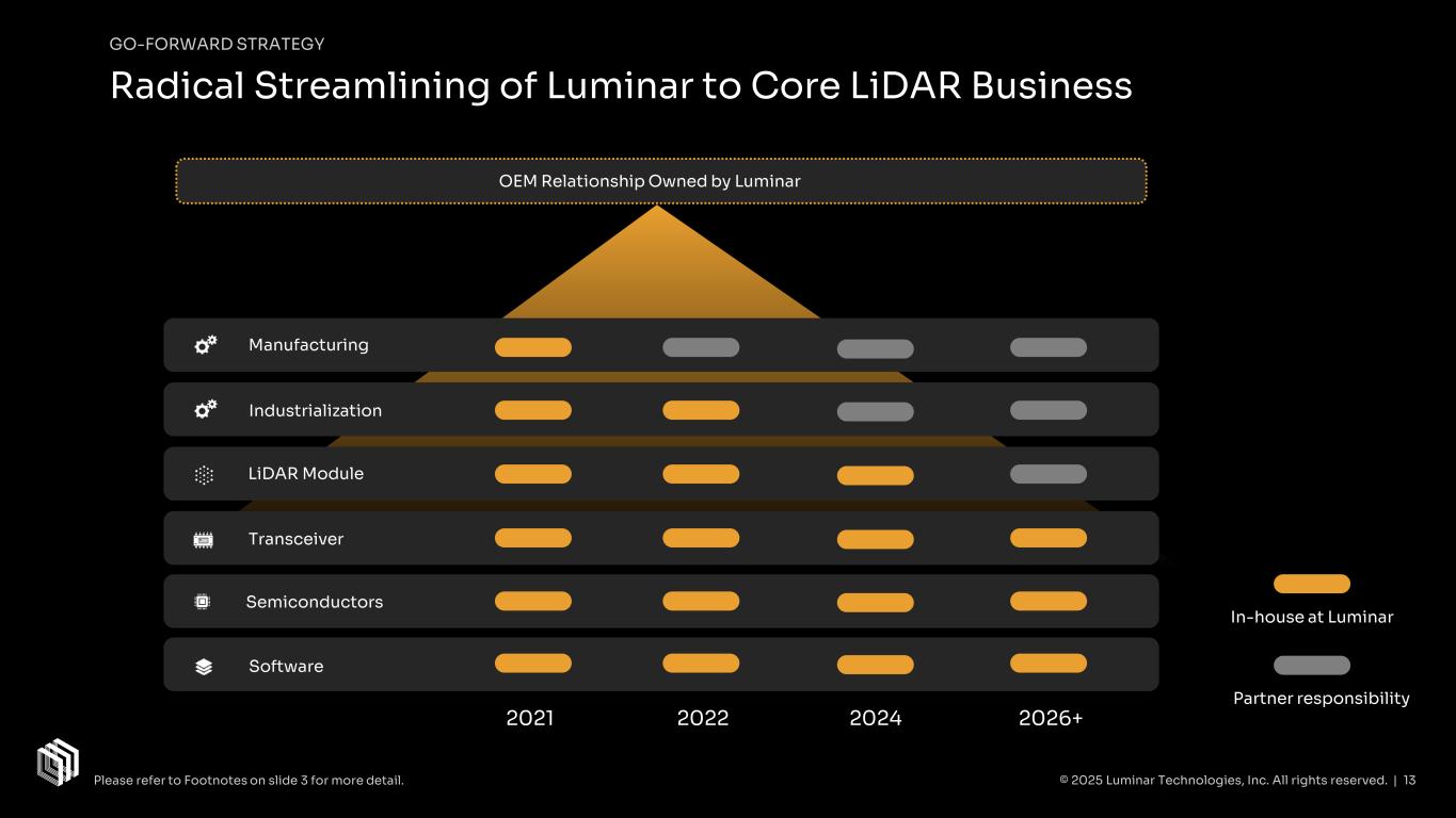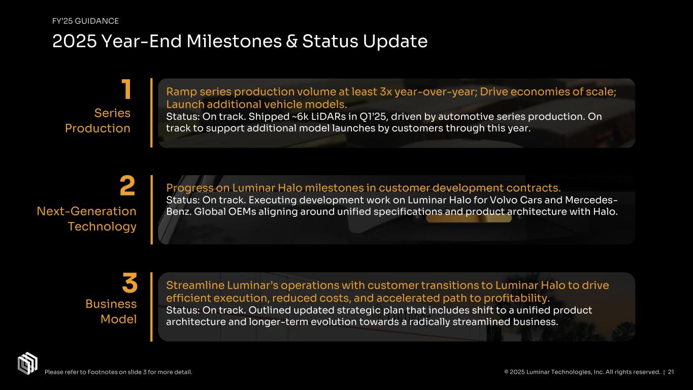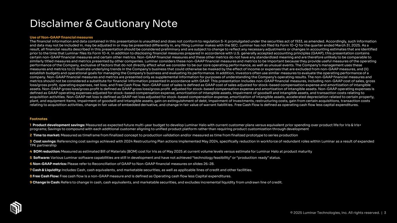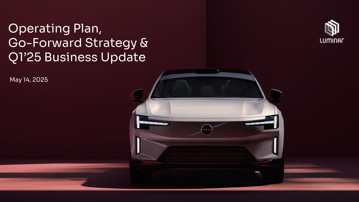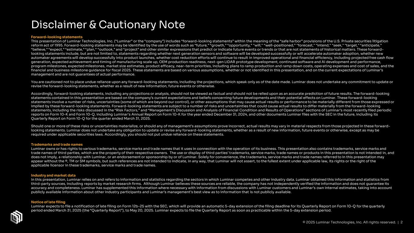 Forward-looking statements This presentation of Luminar Technologies, Inc. (“Luminar” or the “company”) includes “forward-looking statements” within the meaning of the “safe harbor” provisions of the U.S. Private securities litigation reform act of 1995. Forward-looking statements may be identified by the use of words such as “future,” “growth,” “opportunity,” "will," “well-positioned,” "forecast," "intend," "seek," "target," “anticipate,” “believe,” “expect,” “estimate,” “plan,” “outlook,” and “project” and other similar expressions that predict or indicate future events or trends or that are not statements of historical matters. These forward- looking statements include, but are not limited to, statements regarding whether next generation sensors and software will be developed successfully or will accelerate automaker adoption, whether new automaker agreements will develop successfully into product launches, whether cost reduction efforts will continue to result in improved operational and financial efficiency, including projected free cash flow generation, expected achievement and timing of manufacturing scale up, OEM production readiness, next-gen LiDAR prototype development, continued software and AI development and performance, program milestones, expected milestones, market size estimates, product efficacy, near-term priorities, including plans to ramp production and ramp down costs, operating expenses and cost of sales, and the financial and business milestone guidance for fiscal 2025. These statements are based on various assumptions, whether or not identified in this presentation, and on the current expectations of Luminar’s management and are not guarantees of actual performance. You are cautioned not to place undue reliance upon any forward-looking statements, including the projections, which speak only as of the date made. Luminar does not undertake any commitment to update or revise the forward-looking statements, whether as a result of new information, future events or otherwise. Accordingly, forward-looking statements, including any projections or analysis, should not be viewed as factual and should not be relied upon as an accurate prediction of future results. The forward-looking statements contained in this presentation are based on the company’s current expectations and beliefs concerning future developments and their potential effects on Luminar. These forward-looking statements involve a number of risks, uncertainties (some of which are beyond our control), or other assumptions that may cause actual results or performance to be materially different from those expressed or implied by these forward-looking statements. Forward-looking statements are subject to a number of risks and uncertainties that could cause actual results to differ materially from the forward-looking statements, including the risks discussed in the “Risk Factors,” and “Management’s Discussion and Analysis of Financial Condition and Results of Operations” sections of Luminar’s most recently filed periodic reports on Form 10-K and Form 10-Q, including Luminar's Annual Report on Form 10-K for the year ended December 31, 2024, and other documents Luminar files with the SEC in the future, including its Quarterly Report on Form 10-Q for the quarter ended March 31, 2025. Should one or more of these risks or uncertainties materialize, or should any of management’s assumptions prove incorrect, actual results may vary in material respects from those projected in these forward- looking statements. Luminar does not undertake any obligation to update or revise any forward-looking statements, whether as a result of new information, future events or otherwise, except as may be required under applicable securities laws. Accordingly, you should not put undue reliance on these statements. Trademarks and trade names Luminar owns or has rights to various trademarks, service marks and trade names that it uses in connection with the operation of its business. This presentation also contains trademarks, service marks and trade names of third parties, which are the property of their respective owners. The use or display of third parties’ trademarks, service marks, trade names or products in this presentation is not intended in, and does not imply, a relationship with Luminar, or an endorsement or sponsorship by or of Luminar. Solely for convenience, the trademarks, service marks and trade names referred to in this presentation may appear without the ®, TM or SM symbols, but such references are not intended to indicate, in any way, that Luminar will not assert, to the fullest extent under applicable law, its rights or the right of the applicable licensor in these trademarks, service marks and trade names. Industry and market data In this presentation, Luminar relies on and refers to information and statistics regarding the sectors in which Luminar competes and other industry data. Luminar obtained this information and statistics from third-party sources, including reports by market research firms. Although Luminar believes these sources are reliable, the company has not independently verified the information and does not guarantee its accuracy and completeness. Luminar has supplemented this information where necessary with information from discussions with Luminar customers and Luminar’s own internal estimates, taking into account publicly available information about other industry participants and Luminar’s management’s best view as to information that is not publicly available. Notice of late filing Luminar expects to file a notification of late filing on Form 12b-25 with the SEC, which will provide an automatic 5-day extension of the filing deadline for its Quarterly Report on Form 10-Q for the quarterly period ended March 31, 2025 (the “Quarterly Report”), to May 20, 2025. Luminar expects to file the Quarterly Report as soon as 