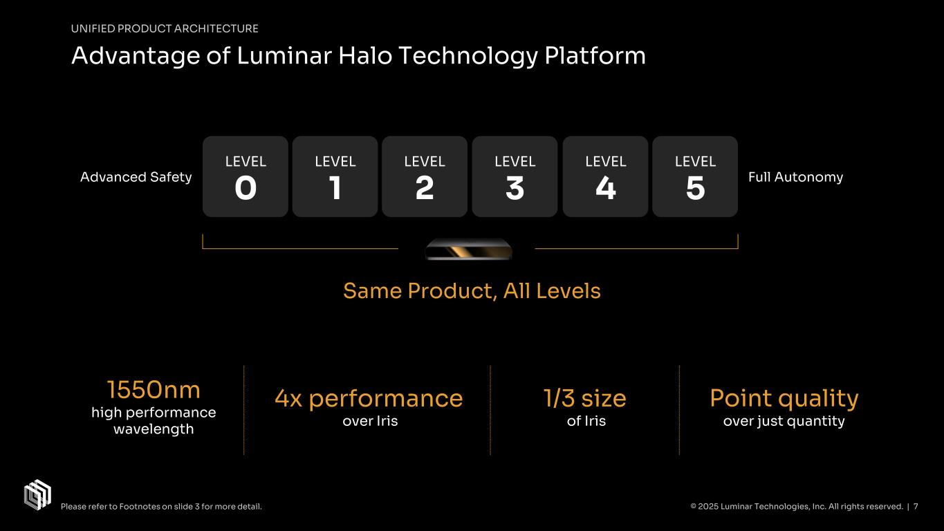 © 2025 Luminar Technologies, Inc. All rights reserved. | 6 UNIFIED PRODUCT ARCHITECTURE Enablers of a Unified Product Architecture: Luminar Halo Cost & Manufacturability OEM Alignment Technology Advantages Please refer to Footnotes on slide 3 for more detail.