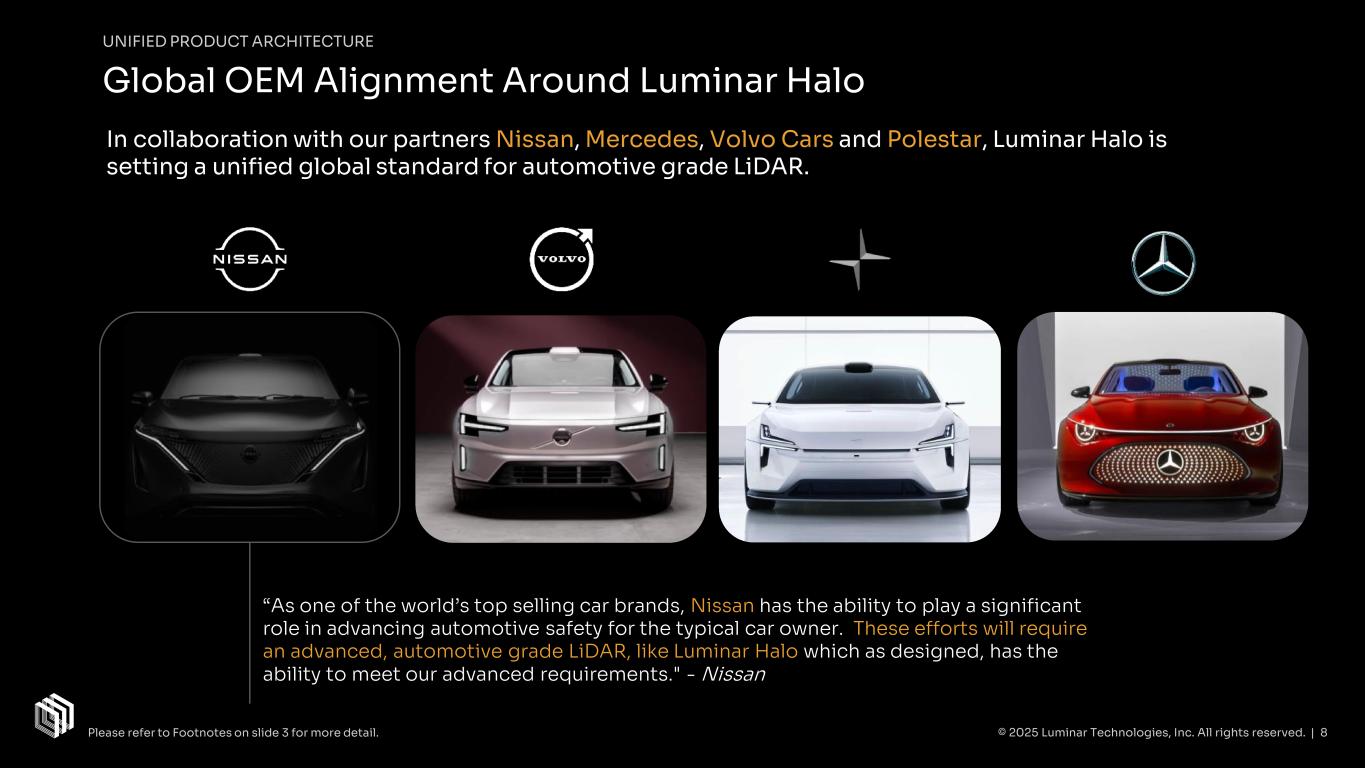 © 2025 Luminar Technologies, Inc. All rights reserved. | 7 UNIFIED PRODUCT ARCHITECTURE Advantage of Luminar Halo Technology Platform 1550nm high performance wavelength 4x performance over Iris Point quality over just quantity LEVEL 0 LEVEL 1 LEVEL 2 LEVEL 4 LEVEL 5 LEVEL 3Advanced Safety Full Autonomy Same Product, All Levels 1/3 size of Iris Please refer to Footnotes on slide 3 for more detail.