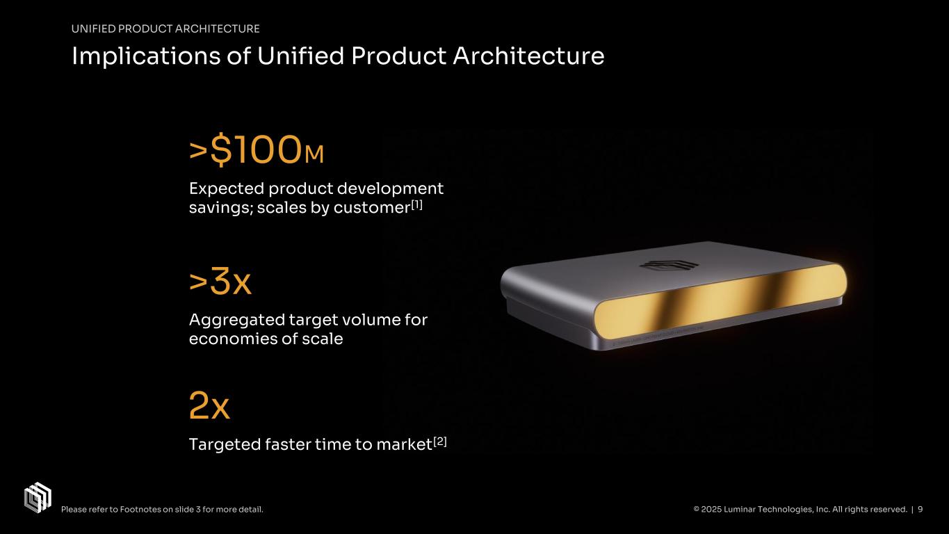 © 2025 Luminar Technologies, Inc. All rights reserved. | 9 UNIFIED PRODUCT ARCHITECTURE Implications of Unified Product Architecture >$100M Expected product development savings; scales by customer[1] Please refer to Footnotes on slide 3 for more detail. >3x Aggregated target volume for economies of scale 2x Targeted faster time to market[2]