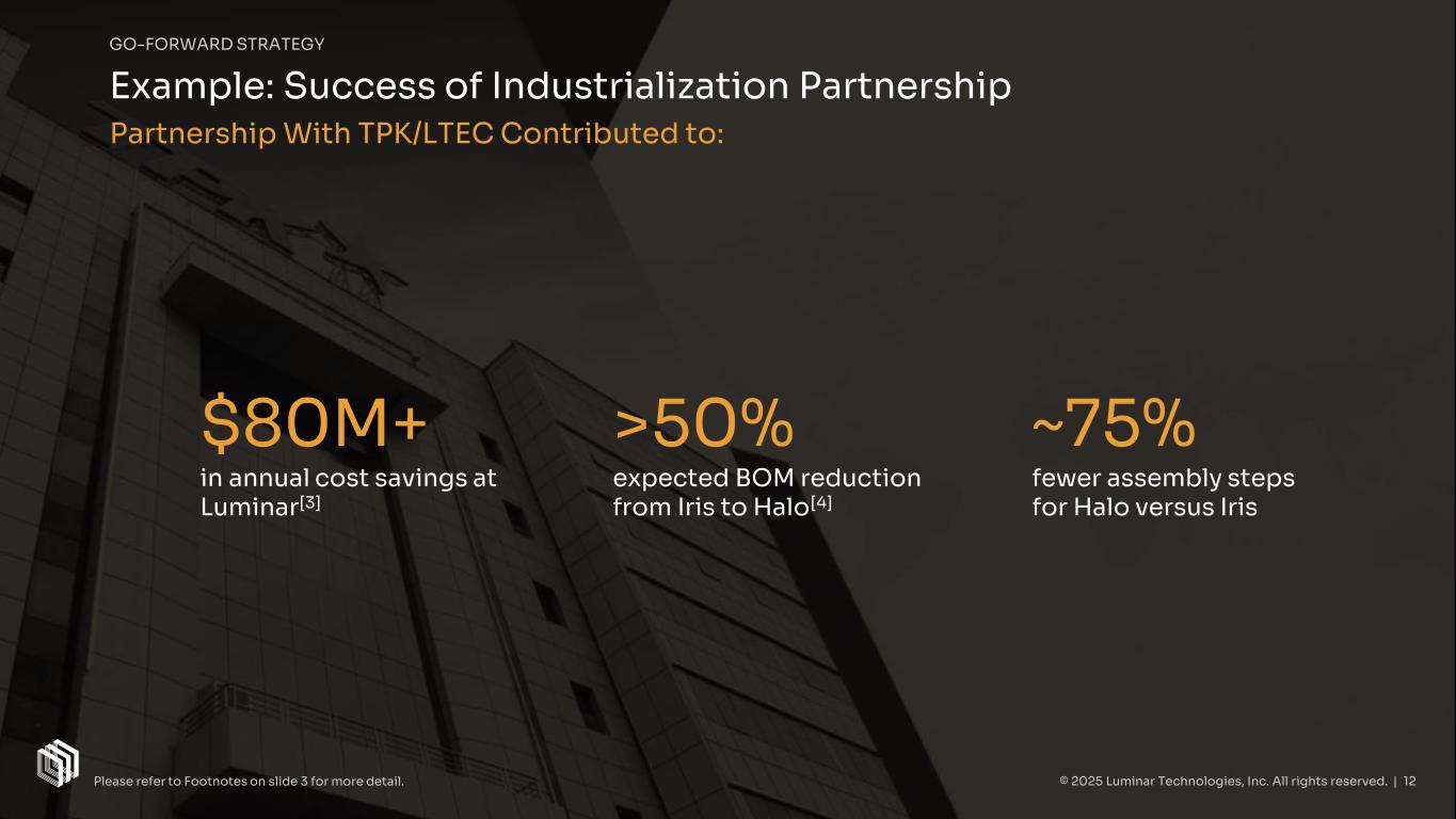 © 2025 Luminar Technologies, Inc. All rights reserved. | 12 GO-FORWARD STRATEGY Example: Success of Industrialization Partnership Partnership With TPK/LTEC Contributed to: $80M+ in annual cost savings at Luminar[3] >50% expected BOM reduction from Iris to Halo[4] ~75% fewer assembly steps for Halo versus Iris Please refer to Footnotes on slide 3 for more detail.