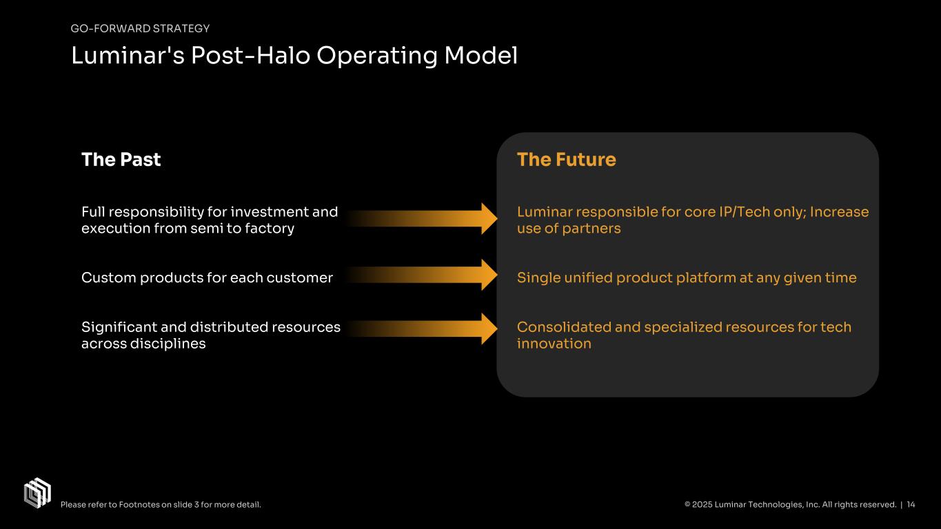 GO-FORWARD STRATEGY © 2025 Luminar Technologies, Inc. All rights reserved. | 13 Transceiver LiDAR Module Semiconductors (Receiver, Laser, Digital ASIC) Industrialization Software Manufacturing 2022 2024 2026+2021 Semiconductors OEM Relationship Owned by Luminar Radical Streamlining of Luminar to Core LiDAR Business In-house at Luminar Partner responsibility Please refer to Footnotes on slide 3 for more detail.