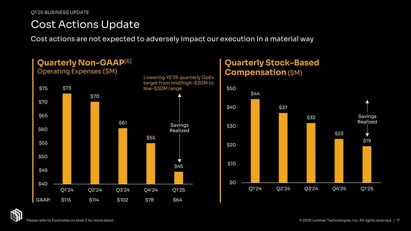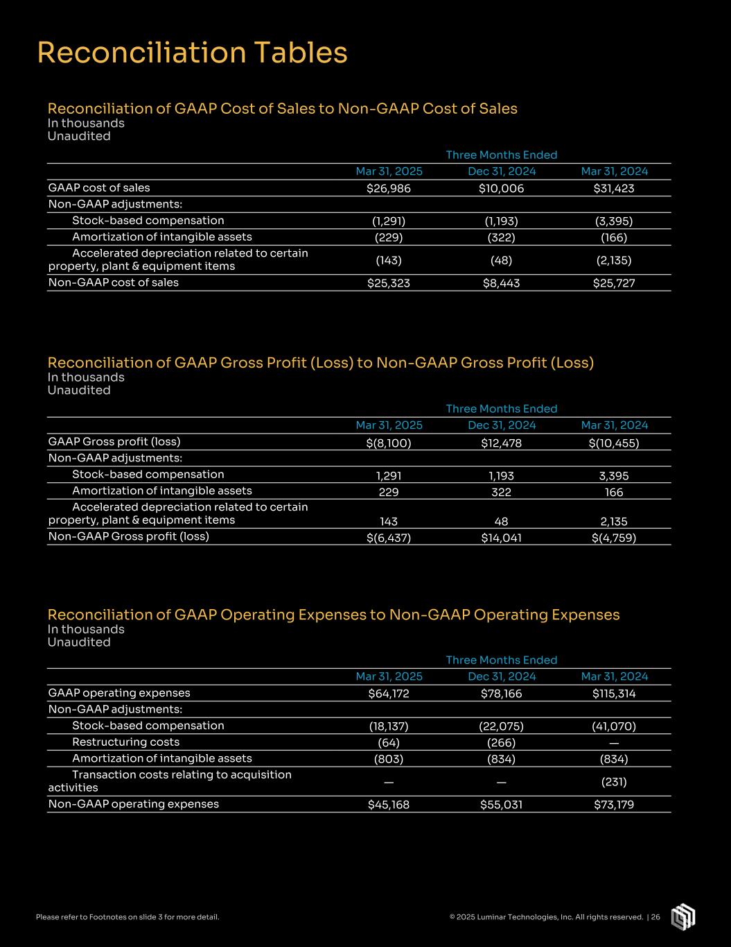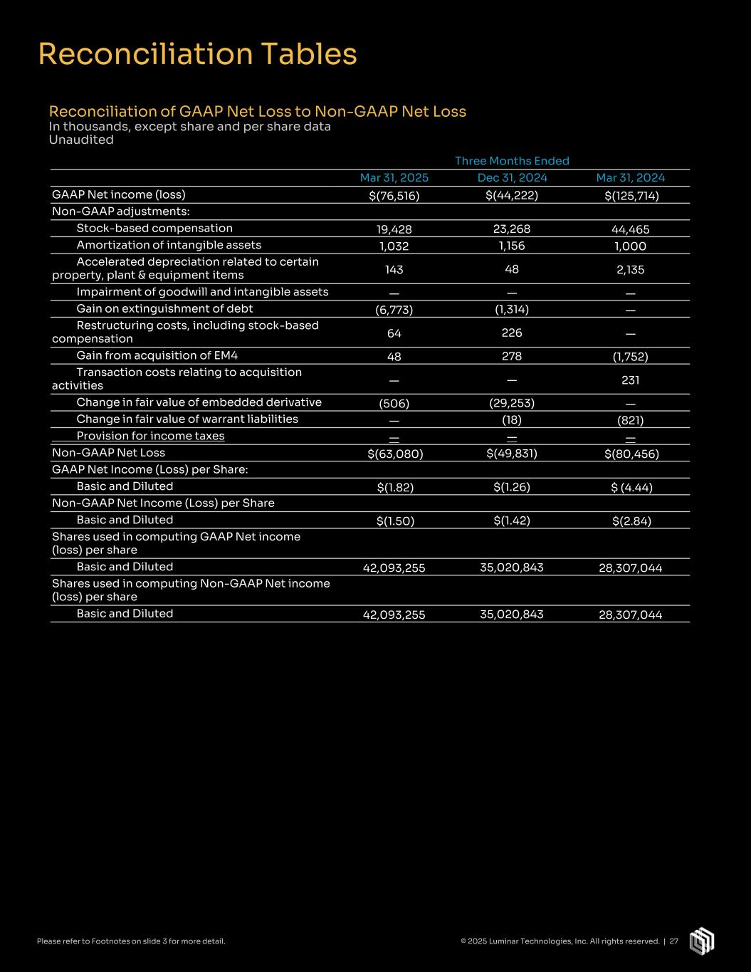 Reconciliation Tables Three Months Ended Mar 31, 2025 Dec 31, 2024 Mar 31, 2024 GAAP Gross profit (loss) $(8,100) $12,478 $(10,455) Non-GAAP adjustments: Stock-based compensation 1,291 1,193 3,395 Amortization of intangible assets 229 322 166 Accelerated depreciation related to certain property, plant & equipment items 143 48 2,135 Non-GAAP Gross profit (loss) $(6,437) $14,041 $(4,759) Reconciliation of GAAP Cost of Sales to Non-GAAP Cost of Sales In thousands Unaudited Reconciliation of GAAP Gross Profit (Loss) to Non-GAAP Gross Profit (Loss) In thousands Unaudited Three Months Ended Mar 31, 2025 Dec 31, 2024 Mar 31, 2024 GAAP operating expenses $64,172 $78,166 $115,314 Non-GAAP adjustments: Stock-based compensation (18,137) (22,075) (41,070) Restructuring costs (64) (266) — Amortization of intangible assets (803) (834) (834) Transaction costs relating to acquisition activities — — (231) Non-GAAP operating expenses $45,168 $55,031 $73,179 Reconciliation of GAAP Operating Expenses to Non-GAAP Operating Expenses In thousands Unaudited Three Months Ended Mar 31, 2025 Dec 31, 2024 Mar 31, 2024 GAAP cost of sales $26,986 $10,006 $31,423 Non-GAAP adjustments: Stock-based compensation (1,291) (1,193) (3,395) Amortization of intangible assets (229) (322) (166) Accelerated depreciation related to certain property, plant & equipment items (143) (48) (2,135) Non-GAAP cost of sales $25,323 $8,443 $25,727 © 2025 Luminar Technologies, Inc. All rights reserved. | 26Please refer to Footnotes on slide 3 for more detail.